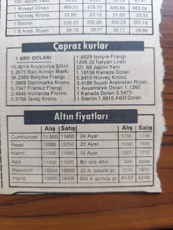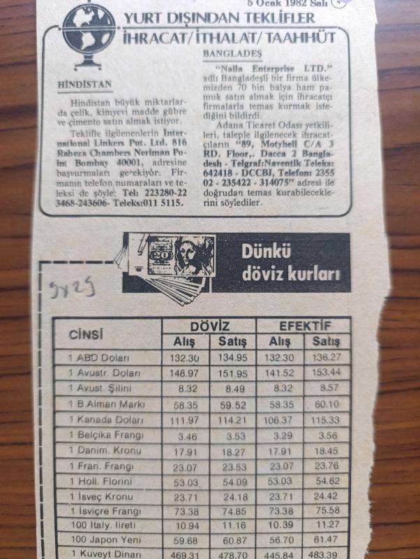 Hürriyet Gazetesi Kupürü - Turkish Newspaper - 3 Ocak 1982 - yurt dışından teklifler - ithalat - ihracat - taahhüt - Hindistan büyük miktarlarda Çelik kimyevi madde gübre ve çimento satın almak istiyor - Naila Enterprise LTD adlı Bangladeşli bir firma ülkemizden 70 bin balya ham pamuk satın almak için ihracatçı firmalarla temas kurmak istediğini bildirdi - dünkü döviz kurları - 1 ABD doları 132.30 - 1 Batı Alman markı 58.35 - 100 Japon Yeni 59.68 - çapraz kurlar - 1 ABD doları 5.7347 Fransız Frangı - altın fiyatları - Cumhuriyet altını 11.500 - Reşat altını 1200 - Napolyon 10250 - Ana Baba okulunda ders veren doğumevi başhekimi Ziya Durmuş düşük yüzünden yılda 10 bin kadın ölüyor dedi - kırsal kesim kadınına spiral eğitim düzeyi yüksek kadına da hap öneriliyor - Şefika Köymen, Sedat Simavi tarafından kaleme alınmıştır. Hürriyet Gazetesi Kupürü - Turkish Newspaper - 3 Ocak 1982 - yurt dışından teklifler - ithalat - ihracat - taahhüt - Hindistan büyük miktarlarda Çelik kimyevi madde gübre ve çimento satın almak istiyor - Naila Enterprise LTD adlı Bangladeşli bir firma ülkemizden 70 bin balya ham pamuk satın almak için ihracatçı firmalarla temas kurmak istediğini bildirdi - dünkü döviz kurları - 1 ABD doları 132.30 - 1 Batı Alman markı 58.35 - 100 Japon Yeni 59.68 - çapraz kurlar - 1 ABD doları 5.7347 Fransız Frangı - altın fiyatları - Cumhuriyet altını 11.500 - Reşat altını 1200 - Napolyon 10250 - Ana Baba okulunda ders veren doğumevi başhekimi Ziya Durmuş düşük yüzünden yılda 10 bin kadın ölüyor dedi - kırsal kesim kadınına spiral eğitim düzeyi yüksek kadına da hap öneriliyor - Şefika Köymen adlı eser Türkçe dilindedir.