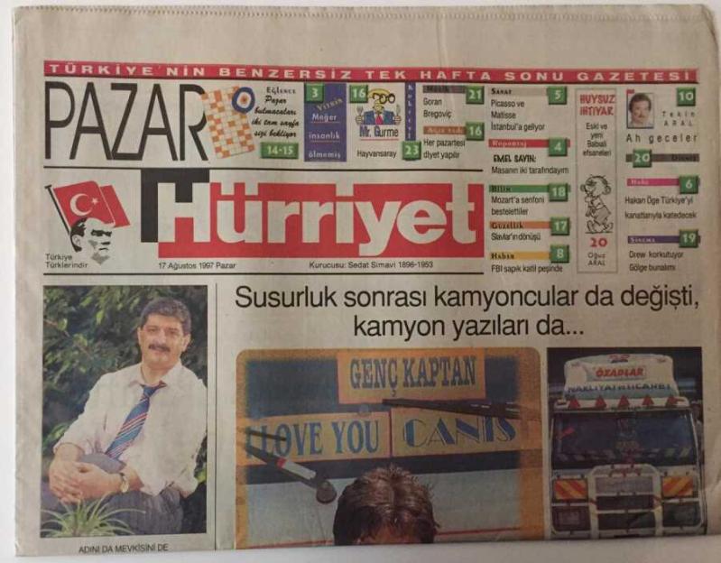 Hürriyet Gazetesi Pazar Eki 17 Ağustos 1997 - Susurluk Sonrası Kamyoncular da Değişti Kamyon Yazıları da... GZ25218, en son 20 gün önce güncellenmiştir.