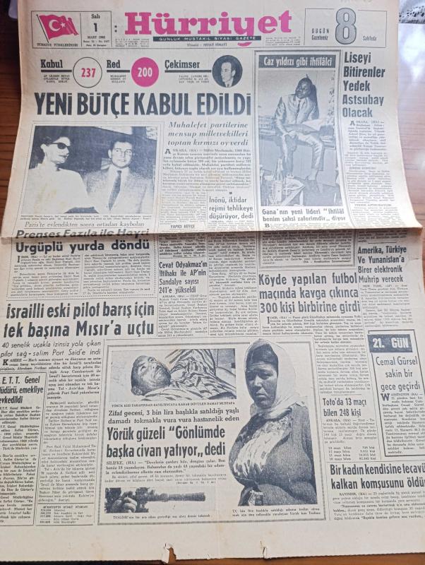 Hürriyet Gazetesi - Turkish Newspaper - 1 Mart 1966 - yeni bütçe kabul edildi kabul 237 red 200 çekimser Çankırı milletvekili M.Ali Arsan - caz yıldızı gibi gana lideri Khow Amihyia Fotoğrafı - liseyi bitirenler yedek astsubay olacak - İsmet İnönü iktidar rejimi tehlikeye düşürüyor dedi - Cevat Odyakmaz'ın İltihakı ile Adalet Partisi'nin sandalye sayısı 241'e yükseldi - İsrail eski pilot Abraham Nathan barış için tek başına Mısıra uçtu - İETT Genel Müdürü Orhan İlter emekliye sevk edildi - Yörük güzeli Teslime zifaf gecesi satıldı yaşlı adamı döve döve hastanelik etti fotoğraf - Cemal Gürsel sakin bir gece geçirdi - aşk ve macera romanı Kader çizgileri çizen Faruk Geç - İstanbul'un kanalizasyonu 25 yılda tamamlanacak - burç falınız - bizimkiler yazan Kemal Bisalman çizen Sezgin Burak - Marshall - artistliği fiyasko ile sona eren Prenses Süreyya köşkü'ne kapandı fotoğraf - anası merkep babası zebra olunca yavru bir acayip çıktı fotoğraf - dünyanın en zengin adamı petrolcü Paul Getty, Sedat Simavi tarafından kaleme alınmıştır. Hürriyet Gazetesi - Turkish Newspaper - 1 Mart 1966 - yeni bütçe kabul edildi kabul 237 red 200 çekimser Çankırı milletvekili M.Ali Arsan - caz yıldızı gibi gana lideri Khow Amihyia Fotoğrafı - liseyi bitirenler yedek astsubay olacak - İsmet İnönü iktidar rejimi tehlikeye düşürüyor dedi - Cevat Odyakmaz'ın İltihakı ile Adalet Partisi'nin sandalye sayısı 241'e yükseldi - İsrail eski pilot Abraham Nathan barış için tek başına Mısıra uçtu - İETT Genel Müdürü Orhan İlter emekliye sevk edildi - Yörük güzeli Teslime zifaf gecesi satıldı yaşlı adamı döve döve hastanelik etti fotoğraf - Cemal Gürsel sakin bir gece geçirdi - aşk ve macera romanı Kader çizgileri çizen Faruk Geç - İstanbul'un kanalizasyonu 25 yılda tamamlanacak - burç falınız - bizimkiler yazan Kemal Bisalman çizen Sezgin Burak - Marshall - artistliği fiyasko ile sona eren Prenses Süreyya köşkü'ne kapandı fotoğraf - anası merkep babası zebra olunca yavru bir acayip çıktı fotoğraf - dünyanın en zengin adamı petrolcü Paul Getty adlı eser Türkçe dilindedir.