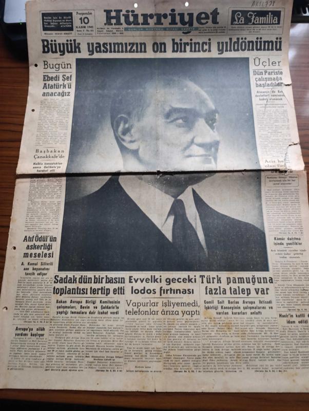 Hürriyet Gazetesi - Turkish Newspaper - 10 Kasım 1949 - büyük yasımızın on birinci yıldönümü - Atatürk'ün fotoğrafı - bugün ebedi şef Atatürk'ü anacağız - Üçler Dün Paris'te çalışmaya başladılar - Başbakan Şemsettin Günaltay Çanakkale'de - Dışişleri bakanımız Necmettin Sadak dün bir basın toplantısı tertip etti - Atıf Ödül'ün askerliği meselesi - Avrupa'ya silah yardımı başlıyor - Hitler'in sığınağında son günler yazan Yüzbaşı Gerhard Boldt Yazı Dizisi - şehir tiyatrosu temsilleri saat 20.30'da başlıyor - Türk prensesi Nilgün yazan Refik Halit Karay Yazı Dizisi - Rita Hayworth'un yapacağı doğum Radyo ile yayınlanacak - Atatürk ve göktürkler yazan Nihat Sami Banarlı - Tavaf şiiri yazan İbrahim Alaaddin Gövsa - tepkili Süpersonik stratosfer uçakları yapıldı - tarihi sofra yazan Faruk Nafiz Çamlıbel - yabancı gözüyle Kemal Atatürk - On bir yıl evvel bugün fotoğraflar - 10 Kasım 1938 Perşembe saat 9'u 5 geçe Dolmabahçe sarayı Fotoğrafı - bütün Türk milleti yana yakılan Atasına ağlıyor, Sedat Simavi tarafından kaleme alınmıştır. Hürriyet Gazetesi - Turkish Newspaper - 10 Kasım 1949 - büyük yasımızın on birinci yıldönümü - Atatürk'ün fotoğrafı - bugün ebedi şef Atatürk'ü anacağız - Üçler Dün Paris'te çalışmaya başladılar - Başbakan Şemsettin Günaltay Çanakkale'de - Dışişleri bakanımız Necmettin Sadak dün bir basın toplantısı tertip etti - Atıf Ödül'ün askerliği meselesi - Avrupa'ya silah yardımı başlıyor - Hitler'in sığınağında son günler yazan Yüzbaşı Gerhard Boldt Yazı Dizisi - şehir tiyatrosu temsilleri saat 20.30'da başlıyor - Türk prensesi Nilgün yazan Refik Halit Karay Yazı Dizisi - Rita Hayworth'un yapacağı doğum Radyo ile yayınlanacak - Atatürk ve göktürkler yazan Nihat Sami Banarlı - Tavaf şiiri yazan İbrahim Alaaddin Gövsa - tepkili Süpersonik stratosfer uçakları yapıldı - tarihi sofra yazan Faruk Nafiz Çamlıbel - yabancı gözüyle Kemal Atatürk - On bir yıl evvel bugün fotoğraflar - 10 Kasım 1938 Perşembe saat 9'u 5 geçe Dolmabahçe sarayı Fotoğrafı - bütün Türk milleti yana yakılan Atasına ağlıyor adlı eser Türkçe dilindedir.