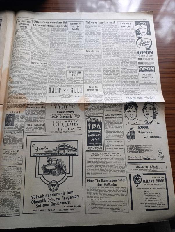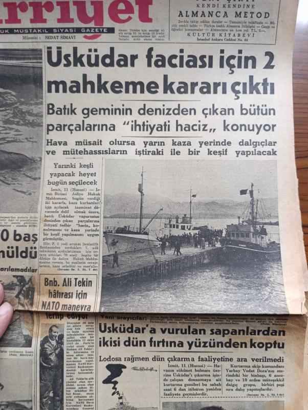 Hürriyet Gazetesi - Turkish Newspaper - 12 Mart 1958 - Türkiye Arap cumhuriyetini resmen tanıdı - Üsküdar vapuru faciası için 2 mahkeme kararı çıktı - batık geminin denizden çıkan bütün parçalarını ihtiyati haciz konuyor - Üsküdar'a vurulan sapanlardan ikisi dün fırtına yüzünden koptu - lodos'a rağmen Üsküdar vapuru çıkarma faaliyetine ara verilmedi - 16 aylık Cem detroit'ten Türkiye'ye mi kaçırıldı - Zapiyon Rum kız lisesinde neler dönüyor - Ege Üniversitesi rektörü Muhittin Erel seçildi - İstanbul'da bugün bu gece sinema tiyatro programı - Turgut Reis yazan Feridun Fazıl Tülbentçi Yazı Dizisi - İki şöhretle bir konuşma Brigitte Bardot ile Françoise Sagan'ın cevapları - Fenerbahçe Manisa karmasını dünkü karşılaşmada 3-1 yendi - Manisalı Hanımlar maçı ayrı yerde izlediler fotoğraf - İstanbulspor Beyoğluspor bugün saat 15.30'da karşılaşıyor - Galatasaray da Eskişehir'de maç yapacak - Galatasaray kaptanı Turgay Şeren dün mukavelesini yeniledi - Çanakkale kupası'nın maçlarının protokolu, Sedat Simavi tarafından kaleme alınmıştır. Hürriyet Gazetesi - Turkish Newspaper - 12 Mart 1958 - Türkiye Arap cumhuriyetini resmen tanıdı - Üsküdar vapuru faciası için 2 mahkeme kararı çıktı - batık geminin denizden çıkan bütün parçalarını ihtiyati haciz konuyor - Üsküdar'a vurulan sapanlardan ikisi dün fırtına yüzünden koptu - lodos'a rağmen Üsküdar vapuru çıkarma faaliyetine ara verilmedi - 16 aylık Cem detroit'ten Türkiye'ye mi kaçırıldı - Zapiyon Rum kız lisesinde neler dönüyor - Ege Üniversitesi rektörü Muhittin Erel seçildi - İstanbul'da bugün bu gece sinema tiyatro programı - Turgut Reis yazan Feridun Fazıl Tülbentçi Yazı Dizisi - İki şöhretle bir konuşma Brigitte Bardot ile Françoise Sagan'ın cevapları - Fenerbahçe Manisa karmasını dünkü karşılaşmada 3-1 yendi - Manisalı Hanımlar maçı ayrı yerde izlediler fotoğraf - İstanbulspor Beyoğluspor bugün saat 15.30'da karşılaşıyor - Galatasaray da Eskişehir'de maç yapacak - Galatasaray kaptanı Turgay Şeren dün mukavelesini yeniledi - Çanakkale kupası'nın maçlarının protokolu adlı eser Türkçe dilindedir.