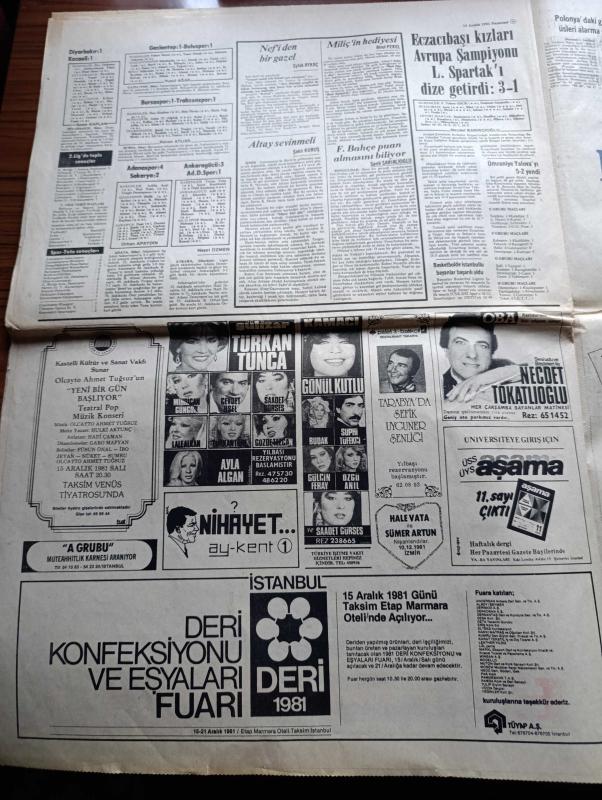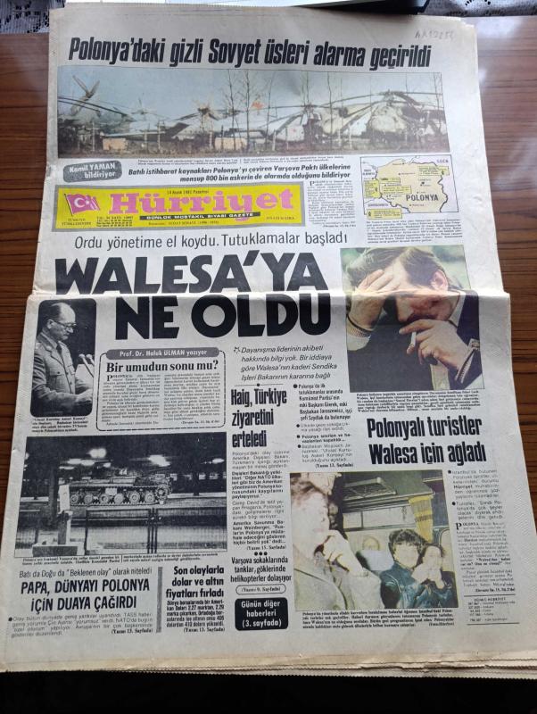 Hürriyet Gazetesi - Turkish Newspaper - 14 Aralık 1981 - polonya'daki gizli Sovyet üsleri alarma geçirildi - Polonya'da Ordu yönetimi el koydu tutuklamalar başladı - Walesa'ya ne oldu - Polonyalı turistler Walesa için ağladı Fotoğrafı - Papa dünyayı Polonya için duaya çağırdı - Polonya'da ilk tutuklananlar arasında Komünist partisinin eski başkanı Gierek de var - Beş bakan istifa etti - THKPC Dev Sol Kurtuluş Türkiye Devrimci Komünist Partisi üyesi 102 militan yakalandı - güzel Farrah Fawcett evlilik yolunda Fotoğrafı - Altan Poyraz İstanbul radyosu müdür muavinliğine atandı - Ahmet Özhan Mevlana törenlerinde ayinhanlık yapıyor Fotoğrafı - Kenan Evren Galatasaray Lisesi'nin 500. Kuruluş yıl dönümü törenlerine katılıyor - Hülya Koçyiğit Müjde Ar Zerrin Egeliler bebek parkta - Muazzez Abacı Mehmet Ali Erbil Erol Evgin büyük Maksimde - Ümit Besen Taksim Lalezar'da - Oba restoranda Necdet Tokatlıoğlu - Galatasaray 0 Altay 0 - Fenerbahçe yine lider - voleybolda Eczacıbaşı zaferi, Sedat Simavi tarafından kaleme alınmıştır. Hürriyet Gazetesi - Turkish Newspaper - 14 Aralık 1981 - polonya'daki gizli Sovyet üsleri alarma geçirildi - Polonya'da Ordu yönetimi el koydu tutuklamalar başladı - Walesa'ya ne oldu - Polonyalı turistler Walesa için ağladı Fotoğrafı - Papa dünyayı Polonya için duaya çağırdı - Polonya'da ilk tutuklananlar arasında Komünist partisinin eski başkanı Gierek de var - Beş bakan istifa etti - THKPC Dev Sol Kurtuluş Türkiye Devrimci Komünist Partisi üyesi 102 militan yakalandı - güzel Farrah Fawcett evlilik yolunda Fotoğrafı - Altan Poyraz İstanbul radyosu müdür muavinliğine atandı - Ahmet Özhan Mevlana törenlerinde ayinhanlık yapıyor Fotoğrafı - Kenan Evren Galatasaray Lisesi'nin 500. Kuruluş yıl dönümü törenlerine katılıyor - Hülya Koçyiğit Müjde Ar Zerrin Egeliler bebek parkta - Muazzez Abacı Mehmet Ali Erbil Erol Evgin büyük Maksimde - Ümit Besen Taksim Lalezar'da - Oba restoranda Necdet Tokatlıoğlu - Galatasaray 0 Altay 0 - Fenerbahçe yine lider - voleybolda Eczacıbaşı zaferi adlı eser Türkçe dilindedir.