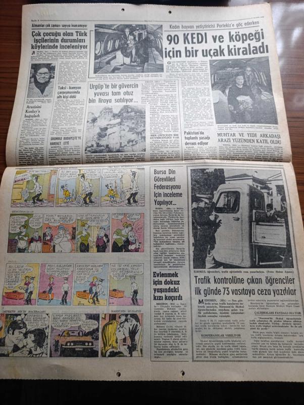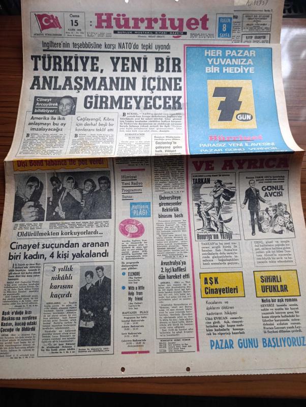 Hürriyet Gazetesi - Turkish Newspaper - 15 Kasım 1968 - İngiltere'nin teşebbüsüne karşı NATO'da tepki uyandı - Türkiye yeni bir anlaşmanın içine girmeyecek Cüneyt Arcayürek bildiriyor - Amerika ile ikili anlaşmayı bu ay imzalayacağız - İhsan Sabri Çağlayangil Kıbrıs için derhal beşli bir konferans teklif etti - haftanın plağı - Gaziantep'te galeyana gelen halk vilayet binasını taşladı - üniversiteye giremeyenler rektörlük binasını bastı - Dişi Gülsüm Öncü tabanca ile poz verdi fotoğraf - Avustralya'ya 2. İşçi kafilesi dün hareket etti - Yıldırım servis - serbest kürsü herkese söz hakkı yöneten Tahsin Öztin - kıymetli sanatkar Nezahat Bayram'ın en son okuduğu türküler Grafson plaklarında - İstanbul Ankara İzmir Radyosu Programı - kadın hayvan yetiştiricisi Margaret Hunter 90 kedi ve köpeği için bir uçak kiraladı fotoğraf - Almanlar çok çocuğu olan Türk işçilerinin durumlarını köylerinde inceliyor - ürgüp'te bir güvercin yuvası tam otuz bin liraya satılıyor - karikatür, Sedat Simavi tarafından kaleme alınmıştır. Hürriyet Gazetesi - Turkish Newspaper - 15 Kasım 1968 - İngiltere'nin teşebbüsüne karşı NATO'da tepki uyandı - Türkiye yeni bir anlaşmanın içine girmeyecek Cüneyt Arcayürek bildiriyor - Amerika ile ikili anlaşmayı bu ay imzalayacağız - İhsan Sabri Çağlayangil Kıbrıs için derhal beşli bir konferans teklif etti - haftanın plağı - Gaziantep'te galeyana gelen halk vilayet binasını taşladı - üniversiteye giremeyenler rektörlük binasını bastı - Dişi Gülsüm Öncü tabanca ile poz verdi fotoğraf - Avustralya'ya 2. İşçi kafilesi dün hareket etti - Yıldırım servis - serbest kürsü herkese söz hakkı yöneten Tahsin Öztin - kıymetli sanatkar Nezahat Bayram'ın en son okuduğu türküler Grafson plaklarında - İstanbul Ankara İzmir Radyosu Programı - kadın hayvan yetiştiricisi Margaret Hunter 90 kedi ve köpeği için bir uçak kiraladı fotoğraf - Almanlar çok çocuğu olan Türk işçilerinin durumlarını köylerinde inceliyor - ürgüp'te bir güvercin yuvası tam otuz bin liraya satılıyor - karikatür adlı eser Türkçe dilindedir.