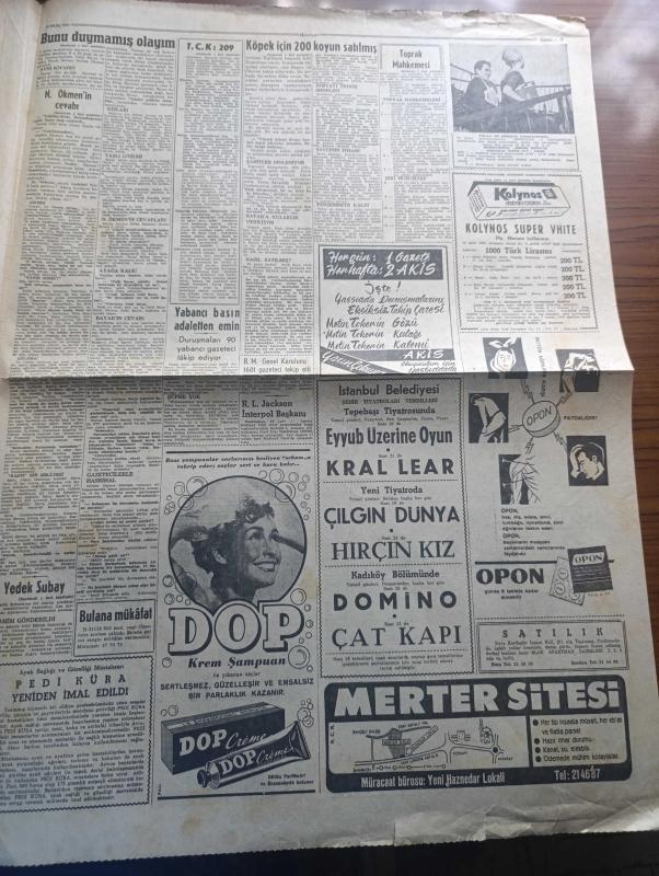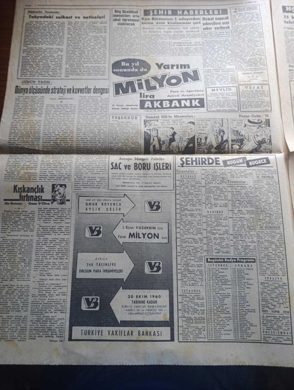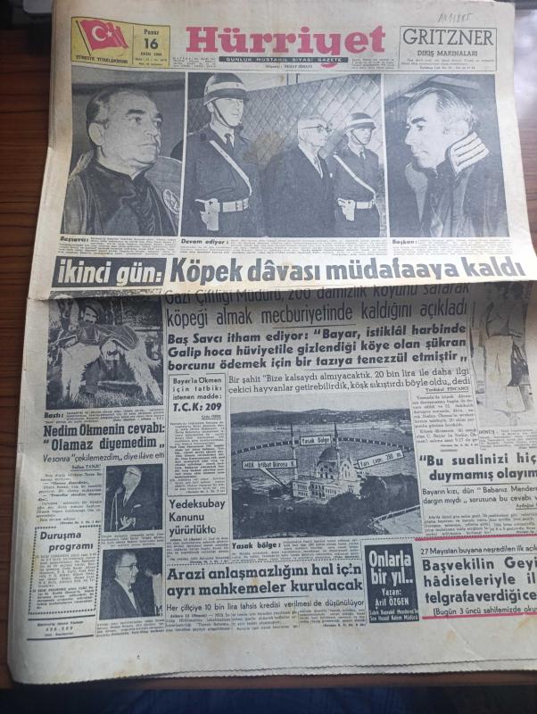 Hürriyet Gazetesi - Türkish Newspaper - 16 Ekim 1960 - köpek davası müdafaaya kaldı - Celal Bayar dün üçüncü defa Yüksek Adalet Divanı'nın huzuruna çıkmıştır Fotoğrafı - Yüksek Adalet Divanı İddaa makamının en büyük başı Altay Ömer Egesel fotoğraf - Yüksek Adalet Divanı başkanı Salim Başol fotoğraf - resimde fotoğrafçılara adeta poz veren dava konusu Bastı giyinik halde görülüyor - Nedim Ökmen'in cevabı olamaz diyemedim - Gazi çiftliği müdürü Tarık Rona 200 damızlık koyunu satarak köpeği almak mecburiyetinde kaldığını açıkladı - başsavcı itham ediyor Celal Bayar İstiklal harbinde Galip hoca hüviyetiyle köye olan Şükran borcunu ödemek için bir tazıya tenezzül etmiştir - Dolmabahçe camii'ndeki milli birlik komitesi irtibat bürosu yasak bölge ilan edildi fotoğraf - Celal Bayar'ın kızı Nilüfer Gürsoy babanız Adnan Menderesle dargın mıydı sorusuna bu sualinizi duymamış olayım dedi - başvekil Adnan Menderes'in geyikli hadiseleri ile ilgili telgrafa verdiği cevap - Köy enstitüsü mezunları adlı eser, Kitap > Süreli Yayınlar > Gazeteler > Türkiye > Genel > Günlük kategorisinde İkinci El olarak satıştadır.