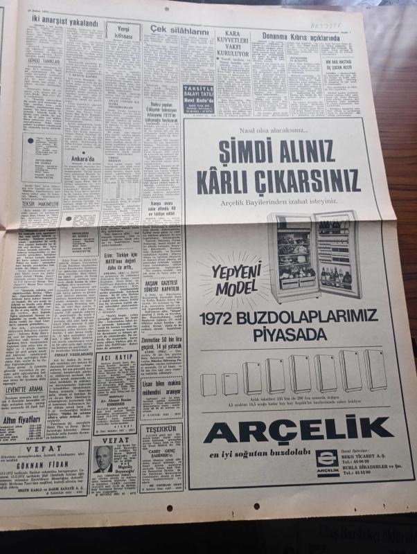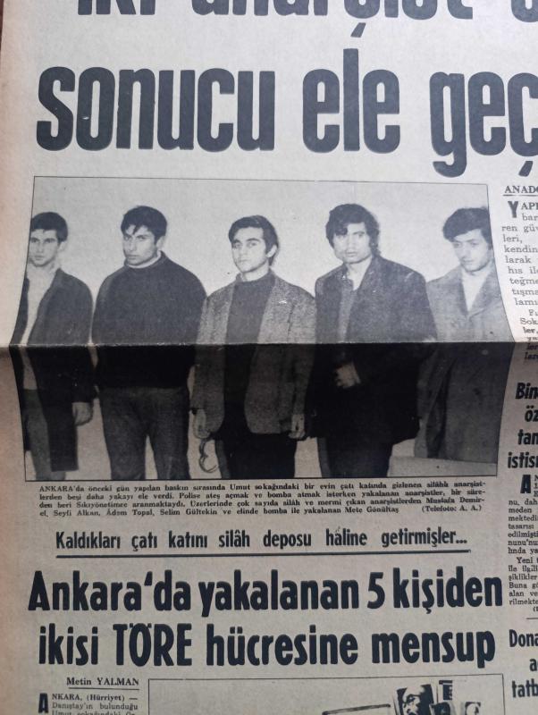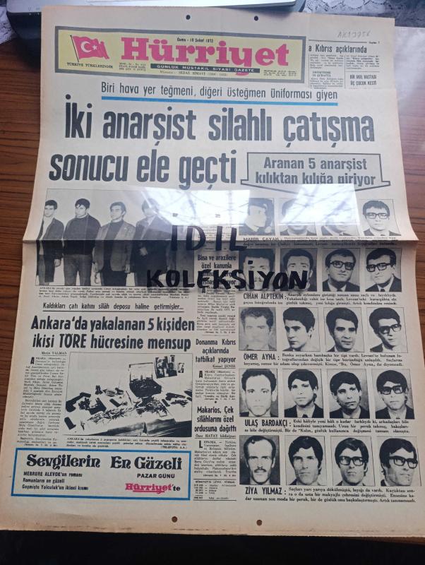 Hürriyet Gazetesi - Turkish Newspaper - 18 Şubat 1972 - Biri Hava yer teğmeni diğeri üsteğmen üniforması giyen iki anarşist silahlı çatışma sonucu ele geçti - aranan 5 anarşist Mahir Çayan Cihan Alptekin Ömer Ayna Ulaş Bardakçı ve Ziya Yılmaz kılıktan kılığa giriyorlar - Ankara'da önceki gün yapılan baskın sırasında Umut sokağındaki bir evin çatı katında gizlenen silahlı anarşistlerden beşi yakalandı - elinde bomba ile yakalanan Mete Gönültaş Fotoğrafı - Ankara'da yakalanan 5 kişiden 2'si Nahit Töre hücresine mensup - donanma Kıbrıs açıklarında tatbikat yapıyor - Makarios çek silahlarını özel ordusuna dağıttı - Eyüp Camii'nde Eyüplü Hoca hafız Yusuf Kenan Turak için mevlit - Tarkan yazan ve çizen Sezgin Burak - gurbetteki sevgili yazan ve çizen Faruk Geç - püf noktası hazırlayan Leyla Soykut - Nihat Erim Türkiye için NATO'nun değeri daha da arttı - Akşam Gazetesi süresiz kapatıldı - boksör Muhammed Ali Clay İslam Üniversitesi kurmak için kampanya açtı fotoğraf - Ratna Dawi Sukarno foto adlı eser, Kitap > Süreli Yayınlar > Gazeteler > Türkiye > Genel > Günlük kategorisinde İkinci El olarak satıştadır.