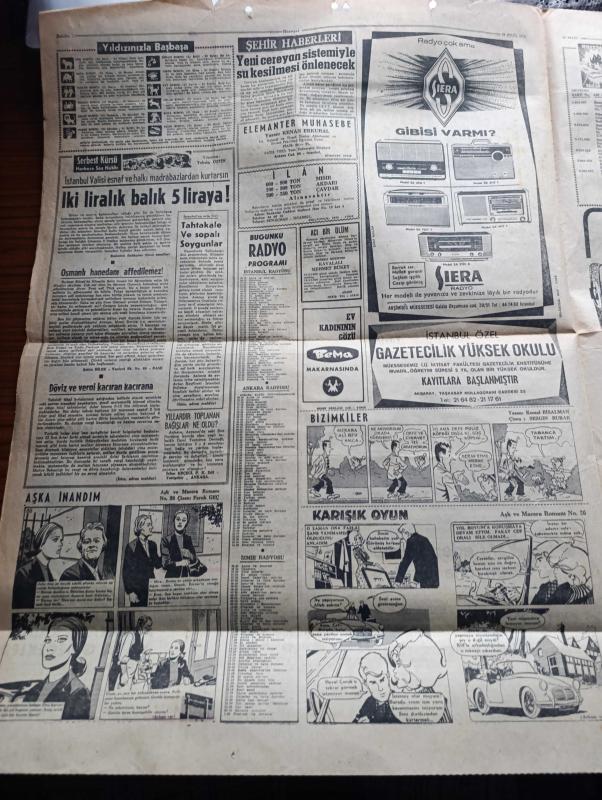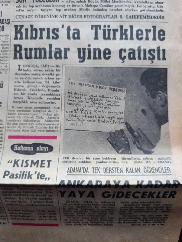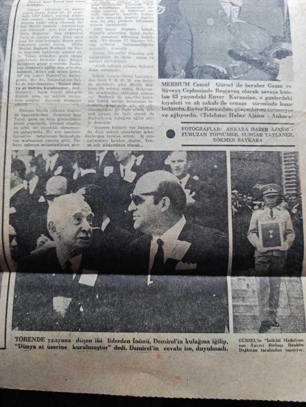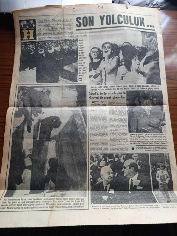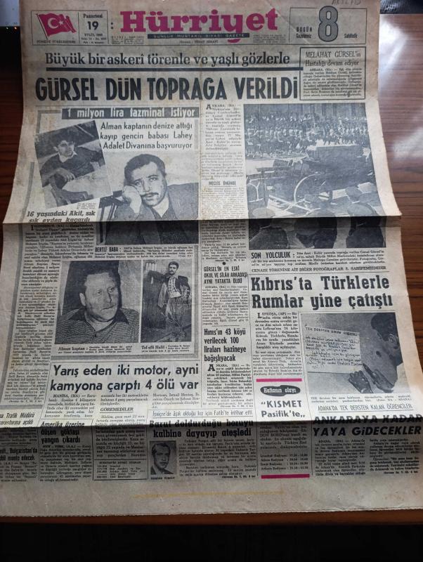Hürriyet Gazetesi - Turkish Newspaper - 19 Eylül 1966 - büyük bir askeri törenle ve yaşlı gözlerle Cemal Gürsel Dün toprağa verildi - Cemal Gürsel Anıtkabir'in yanında toprağa verilmeden önce top arabasında Fotoğrafı - Melahat Gürsel'in hastalığı devam ediyor - Alman kaptanın denize attığı kayıp genç Akif İyigün'ün babası 1 milyon lira tazminat istiyor fotoğraf - Cemal Gürsel'in en eski okul ve silah arkadaşı Yusuf Adil Egeli aynı yatakta öldü - Hınısın 43 köyü verilecek 100 liraları hazineye başlayacak - Kıbrıs'ta Türklerle Rumlar yine çatıştı - Adana'da tek dersten kalan öğrenciler Ankara'ya kadar yaya gidecekler - Adana trafik müdürü Kemal kermen için soruşturma açıldı - Renault Bulgaristan'da otomobil monte edecek - aşka inandım yazan ve çizen Faruk Geç - Burç falınız - İstanbul Ankara İzmir Radyosu Programı - yeni cereyan sistemi ile su kesilmesi önlenecek - Gibbs tıraş kremi - Bossa gömlekleri - Cemal Gürsel'in son yolculuğu - Törende İsmet İnönü Süleyman Demirel Fotoğrafı adlı eser, Kitap > Süreli Yayınlar > Gazeteler > Türkiye > Genel > Günlük kategorisinde İkinci El olarak satıştadır.