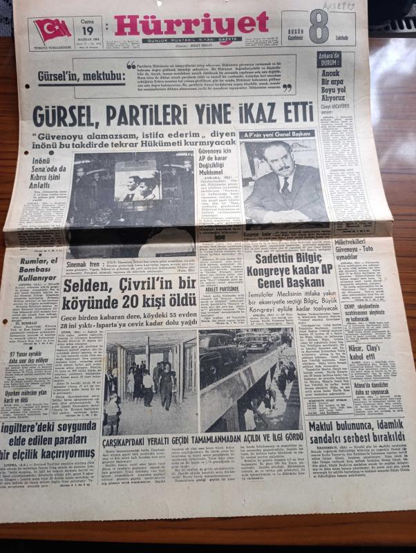 Hürriyet Gazetesi - Turkish Newspaper - 19 Haziran 1964 - Cemal Gürsel'in mektubu - Cemal Gürsel partileri yine ikaz etti - İsmet İnönü senato'da da Kıbrıs işini anlattı - güvenoyu için adalet partisinde karar değişikliği muhtemel - Sadettin Bilgiç kongre'ye kadar Adalet Partisi Genel Başkanı Fotoğrafı - milletvekilleri güvenoyu toto oynadılar - Cumhuriyetçi Köylü Millet Partisi sıkıyönetimin uzatılmasının aleyhinde oy kullanacak - Birleşik Arap Cumhuriyeti başkanı ağır siklet boks şampiyonu Muhammed Ali Clay'i kabul etti - Adana'da dansözler daha az soyunacak - Çarşıkapıdaki yeraltı geçidi tamamlanmadan açıldı ve ilgi gördü fotoğraf - Rumlar el bombası kullanıyor - Sinemalı tren fotoğraf - Bir hayal uğruna çizen Faruk Geç - bizimkiler yazan Kemal Bisalman çizen Sezgin Burak - İstanbul Ankara Radyosu Programı - kesenize göre yaz tatili Side - Manavgat şelalesi fotoğraf - Side'de ortalama bir öğün yemek 7,5 liraya yenilebilir - Side'yi süsleyen tarihi eserlerden biri fotoğraf, Sedat Simavi tarafından kaleme alınmıştır. Hürriyet Gazetesi - Turkish Newspaper - 19 Haziran 1964 - Cemal Gürsel'in mektubu - Cemal Gürsel partileri yine ikaz etti - İsmet İnönü senato'da da Kıbrıs işini anlattı - güvenoyu için adalet partisinde karar değişikliği muhtemel - Sadettin Bilgiç kongre'ye kadar Adalet Partisi Genel Başkanı Fotoğrafı - milletvekilleri güvenoyu toto oynadılar - Cumhuriyetçi Köylü Millet Partisi sıkıyönetimin uzatılmasının aleyhinde oy kullanacak - Birleşik Arap Cumhuriyeti başkanı ağır siklet boks şampiyonu Muhammed Ali Clay'i kabul etti - Adana'da dansözler daha az soyunacak - Çarşıkapıdaki yeraltı geçidi tamamlanmadan açıldı ve ilgi gördü fotoğraf - Rumlar el bombası kullanıyor - Sinemalı tren fotoğraf - Bir hayal uğruna çizen Faruk Geç - bizimkiler yazan Kemal Bisalman çizen Sezgin Burak - İstanbul Ankara Radyosu Programı - kesenize göre yaz tatili Side - Manavgat şelalesi fotoğraf - Side'de ortalama bir öğün yemek 7,5 liraya yenilebilir - Side'yi süsleyen tarihi eserlerden biri fotoğraf adlı eser Türkçe dilindedir.