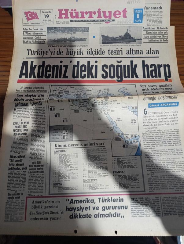 Hürriyet Gazetesi - Turkish Newspaper - 19 Şubat 1969 - Türkiye'yi de büyük ölçüde tesiri altına alan akdeniz'deki soğuk harp - artık bir İsrail bile 6. Filo'ya güvenemez çağıramaz çünkü İvan akdeniz'dedir - 626 Kildin Rus Akdeniz filosunun en güçlü destroyerlerindendir fotoğraf - Amerika'nın Akdeniz'de Rusya'dan daha çok harp gemisi var - Akdeniz'de kimin nerede neleri var harita - Adalet Partisi İstanbul milletvekili Profesör Aydın Yalçın'ın önergesinde son olaylar için meclis araştırması açılması istendi - Cüneyt Arcayürek - taksim'deki kanlı olayın henüz tek suçlusu dahi bulunamadı - İçişleri Bakanı Faruk Sükan 3.5 senedir istifa etmemi bekliyorlar dedi - taksim'deki pazar günkü olaylarda can veren müteahhit Ali Turgut Aytaç'ta toprağa verildi - Amerika'nın en büyük gazetesi The New York Times Amerika Türklerin haysiyet ve gururunu dikkate almalıdır dedi - Gönül avcısı yazan Faruk Geç - Tarkan Honoriva'nın yüzüğü yazan ve çizen Sezgin Burak - Kıbrıslı mücahitler felekten gece çaldı adlı eser, Kitap > Süreli Yayınlar > Gazeteler > Türkiye > Genel > Günlük kategorisinde İkinci El olarak satıştadır.