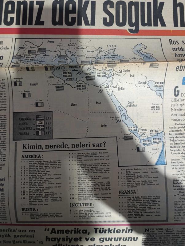 Hürriyet Gazetesi - Turkish Newspaper - 19 Şubat 1969 - Türkiye'yi de büyük ölçüde tesiri altına alan akdeniz'deki soğuk harp - artık bir İsrail bile 6. Filo'ya güvenemez çağıramaz çünkü İvan akdeniz'dedir - 626 Kildin Rus Akdeniz filosunun en güçlü destroyerlerindendir fotoğraf - Amerika'nın Akdeniz'de Rusya'dan daha çok harp gemisi var - Akdeniz'de kimin nerede neleri var harita - Adalet Partisi İstanbul milletvekili Profesör Aydın Yalçın'ın önergesinde son olaylar için meclis araştırması açılması istendi - Cüneyt Arcayürek - taksim'deki kanlı olayın henüz tek suçlusu dahi bulunamadı - İçişleri Bakanı Faruk Sükan 3.5 senedir istifa etmemi bekliyorlar dedi - taksim'deki pazar günkü olaylarda can veren müteahhit Ali Turgut Aytaç'ta toprağa verildi - Amerika'nın en büyük gazetesi The New York Times Amerika Türklerin haysiyet ve gururunu dikkate almalıdır dedi - Gönül avcısı yazan Faruk Geç - Tarkan Honoriva'nın yüzüğü yazan ve çizen Sezgin Burak - Kıbrıslı mücahitler felekten gece çaldı, Sedat Simavi tarafından kaleme alınmıştır. Hürriyet Gazetesi - Turkish Newspaper - 19 Şubat 1969 - Türkiye'yi de büyük ölçüde tesiri altına alan akdeniz'deki soğuk harp - artık bir İsrail bile 6. Filo'ya güvenemez çağıramaz çünkü İvan akdeniz'dedir - 626 Kildin Rus Akdeniz filosunun en güçlü destroyerlerindendir fotoğraf - Amerika'nın Akdeniz'de Rusya'dan daha çok harp gemisi var - Akdeniz'de kimin nerede neleri var harita - Adalet Partisi İstanbul milletvekili Profesör Aydın Yalçın'ın önergesinde son olaylar için meclis araştırması açılması istendi - Cüneyt Arcayürek - taksim'deki kanlı olayın henüz tek suçlusu dahi bulunamadı - İçişleri Bakanı Faruk Sükan 3.5 senedir istifa etmemi bekliyorlar dedi - taksim'deki pazar günkü olaylarda can veren müteahhit Ali Turgut Aytaç'ta toprağa verildi - Amerika'nın en büyük gazetesi The New York Times Amerika Türklerin haysiyet ve gururunu dikkate almalıdır dedi - Gönül avcısı yazan Faruk Geç - Tarkan Honoriva'nın yüzüğü yazan ve çizen Sezgin Burak - Kıbrıslı mücahitler felekten gece çaldı adlı eser Türkçe dilindedir.