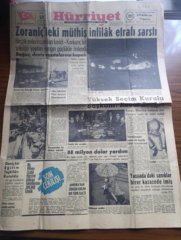 Hürriyet Gazetesi - Turkish Newspaper - 20 Aralık 1960 - Peter Zoraniç tankerindeki müthiş infilak etrafı sarstı fotoğraf - boğazda birçok evlerin camları kırıldı korkunç bir şekilde yayılan yangın güçlükle önlendi - biri Amerika'da biri de Almanya vuku bulan Asrın en büyük hava faciası fotoğraf - Peter Zoraniç tankeri denizi de yaktı fotoğraf - Yüksek Seçim kurulu Başkanı Recai Seçkin - yeraltındaki sularda kayda tabi tutulacak - yassıada'daki sanıklar birer kazazede imiş - yazışmalar öz Türkçe olacak - Behiye Aksoy'un yeni okuduğu plaklar Şençalarda - Necla Engin Çin pavyonunda - Ayşecik şeytan geçti başrolde Zeynep Değirmencioğlu Eşref Kolçak Belgin Doruk Hulusi Kentmen yeni melek ve İnci sinemasında - büyücüler de siyasete karışıyor - Sevim Şenöz'ün yeni okuduğu plak Şençalarda - Fenerbahçe Beşiktaşla pazar günü karşılaşıyor - Galatasaray Kulübü Dün bir bayram günü yaşadı - Fenerbahçe umumi kaptanı Niyazi Sel dün istifa etti - Metin Oktay fotoğraf, Sedat Simavi tarafından kaleme alınmıştır. Hürriyet Gazetesi - Turkish Newspaper - 20 Aralık 1960 - Peter Zoraniç tankerindeki müthiş infilak etrafı sarstı fotoğraf - boğazda birçok evlerin camları kırıldı korkunç bir şekilde yayılan yangın güçlükle önlendi - biri Amerika'da biri de Almanya vuku bulan Asrın en büyük hava faciası fotoğraf - Peter Zoraniç tankeri denizi de yaktı fotoğraf - Yüksek Seçim kurulu Başkanı Recai Seçkin - yeraltındaki sularda kayda tabi tutulacak - yassıada'daki sanıklar birer kazazede imiş - yazışmalar öz Türkçe olacak - Behiye Aksoy'un yeni okuduğu plaklar Şençalarda - Necla Engin Çin pavyonunda - Ayşecik şeytan geçti başrolde Zeynep Değirmencioğlu Eşref Kolçak Belgin Doruk Hulusi Kentmen yeni melek ve İnci sinemasında - büyücüler de siyasete karışıyor - Sevim Şenöz'ün yeni okuduğu plak Şençalarda - Fenerbahçe Beşiktaşla pazar günü karşılaşıyor - Galatasaray Kulübü Dün bir bayram günü yaşadı - Fenerbahçe umumi kaptanı Niyazi Sel dün istifa etti - Metin Oktay fotoğraf adlı eser Türkçe dilindedir.