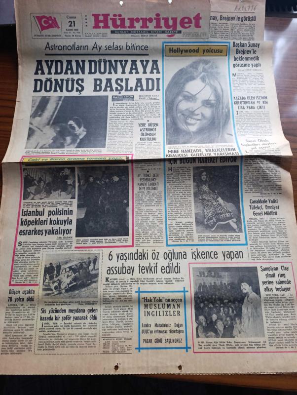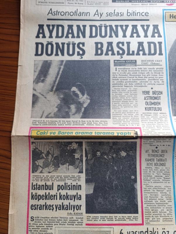 Hürriyet Gazetesi - Turkish Newspaper - 21 Kasım 1969 - astronotların ay sefası bitince Aydan dünyaya dönüş başladı - Apollo 1 ile Ay'a bir iniş yapan Conrad ile Bean Ay'da iki defa yürümüşlerdir fotoğraf - Mine Hanzade Hollywood yolcusu fotoğraflar - Başkan Cevdet Sunay Brejnev ile beklenmedik görüşme yaptı - yere düşen astronot Charles Conrad ölümden kurtuldu - Ay ikinci defa fethedilince kameri tarikatı ikiye bölündü - Çanakkale valisi Celal Tüfekçi emniyet genel müdürü oldu - şampiyon boksör Muhammed Ali Clay şimdi ring yerine sahnede alkış topluyor fotoğraf - İstanbul polisinin köpekleri Caki ve Baron arama tarama yaptı fotoğraf - sanat okulu boykotları olaylara yol açtı - Tarkan gümüş eyer yazan ve çizen Sezgin Burak - Alamanya'dan gelecek mektup yazan çizen Faruk Geç - Gediz dağları eşkiya dolu - 58'li telefonlar yılbaşına kadar çalışacak - Flora sofra margarini - Avrupa'nın bir numaralı hovardası Günter Sachs Ve sevgilisi Mirja Larsson av köşkü'ne kapandı fotoğraflar adlı eser, Kitap > Süreli Yayınlar > Gazeteler > Türkiye > Genel > Günlük kategorisinde İkinci El olarak satıştadır.