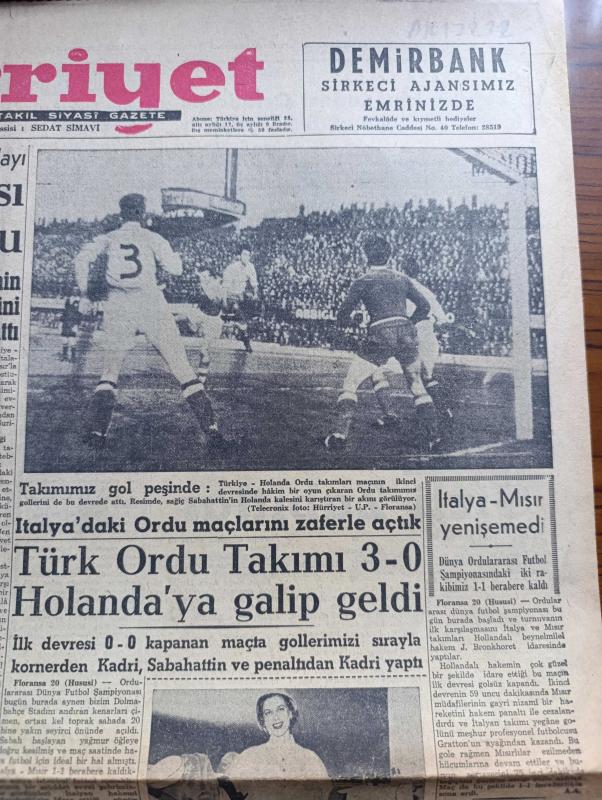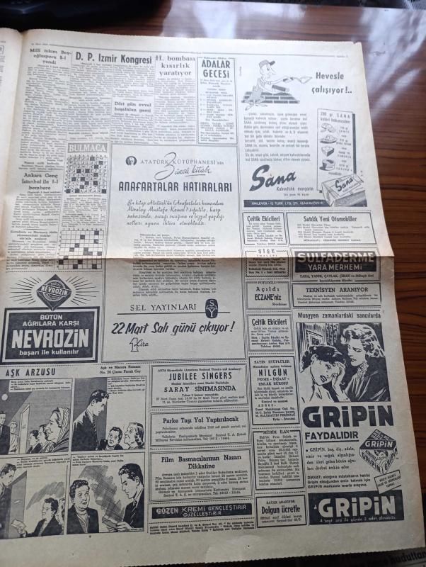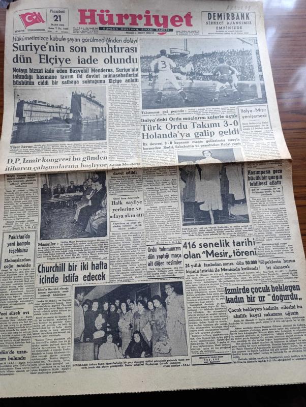 Hürriyet Gazetesi - Turkish Newspaper - 21 Mart 1955 - Suriye'nin son muhtırası Dün elçiye iade olundu - notayı bizzat iade eden başvekil Adnan Menderes - Yüzer havuz Fotoğrafı - italya'daki Ordu maçlarını zaferle açtık Fotoğrafı - Türk ordu takımı 3-0 Hollanda'ya galip geldi - dünya ordulararası futbol şampiyonasında İtalya Mısır yenişemedi - Demokrat Parti İzmir Kongresi bugünden itibaren çalışmalarına başlıyor - Adnan Menderes Endonezya'ya davet edildi - Churchill 1 2 hafta içinde istifa edecek - Ankara koleji öğrencileri dinlenmek için İstanbul'a geldi Haydarpaşa garında Fotoğrafı - Türkiye Masonlar Derneği Kongresi Tepebaşı'nda yapıldı fotoğraf - dünya gazeteleri ne diyor - İstanbul belediyesi ile petrol şirketi arası dava - Adalar gecesi şiir komedi tiyatrosunda takdim eden Muzaffer Tema - Aşk Arzusu çizen Faruk Geç - Türkiye Hollanda Ordu maçından Telecronixle aldığımız fotoğraflar - İsfendiyar ve Ali'nin beraber sürdürdüğü bir akın Fotoğrafı - İstanbul Ankara Radyosu Programı, Sedat Simavi tarafından kaleme alınmıştır. Hürriyet Gazetesi - Turkish Newspaper - 21 Mart 1955 - Suriye'nin son muhtırası Dün elçiye iade olundu - notayı bizzat iade eden başvekil Adnan Menderes - Yüzer havuz Fotoğrafı - italya'daki Ordu maçlarını zaferle açtık Fotoğrafı - Türk ordu takımı 3-0 Hollanda'ya galip geldi - dünya ordulararası futbol şampiyonasında İtalya Mısır yenişemedi - Demokrat Parti İzmir Kongresi bugünden itibaren çalışmalarına başlıyor - Adnan Menderes Endonezya'ya davet edildi - Churchill 1 2 hafta içinde istifa edecek - Ankara koleji öğrencileri dinlenmek için İstanbul'a geldi Haydarpaşa garında Fotoğrafı - Türkiye Masonlar Derneği Kongresi Tepebaşı'nda yapıldı fotoğraf - dünya gazeteleri ne diyor - İstanbul belediyesi ile petrol şirketi arası dava - Adalar gecesi şiir komedi tiyatrosunda takdim eden Muzaffer Tema - Aşk Arzusu çizen Faruk Geç - Türkiye Hollanda Ordu maçından Telecronixle aldığımız fotoğraflar - İsfendiyar ve Ali'nin beraber sürdürdüğü bir akın Fotoğrafı - İstanbul Ankara Radyosu Programı adlı eser Türkçe dilindedir.