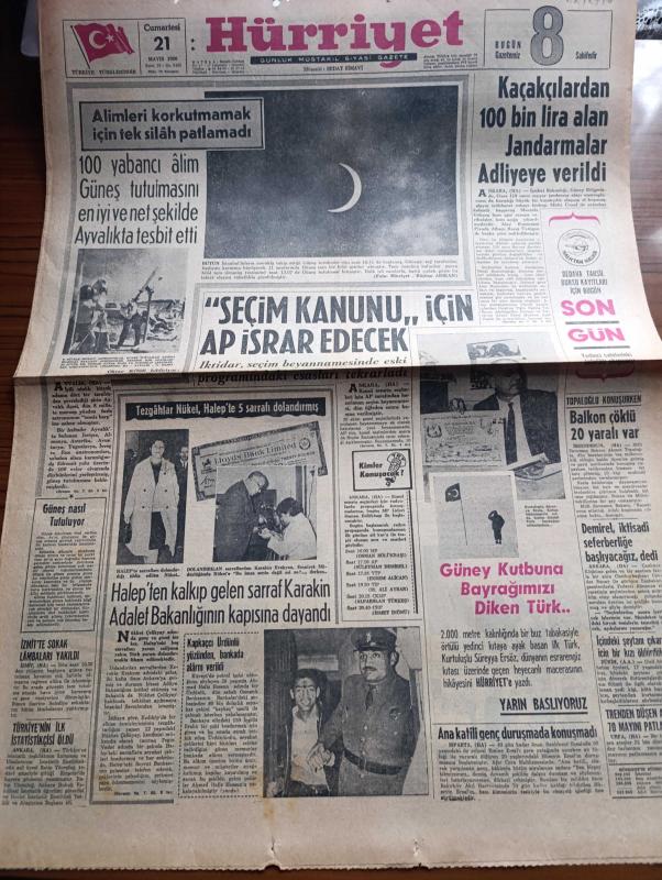 Hürriyet Gazetesi - Turkish Newspaper - 21 Mayıs 1966 - 100 yabancı alim Güneş tutulmasını en iyi ve net şekilde ayvalık'ta tespit etti fotoğraf - alimleri korkutmamak için tek silah patlamadı - istanbullular meraklı takip ettiği Güneş tutulmasını isli camlarla gözlemledi fotoğraf - kaçakçılardan 100 bin lira alan jandarmalar adliyeye verildi - seçim kanunu için Adalet Partisi ısrar edecek - tezgahtar Nükhet Çelikyay halep'te 5 sarrafı dolandırmış fotoğraf - Güneş nasıl tutuluyor - Türkiye'nin ilk istatistikçisi Ratıp Yüceuluğ öldü - Süleyman Demirel iktisadi seferberliğe başlayacağız dedi - aşk ve macera romanı Bu Bir başka aşk çizen Faruk Geç - bizimkiler yazan Kemal Bisalman çizen Sezgin Burak - İstanbul Ankara İzmir Radyosu Programı - Pervin Par öfkeli dağlarda Ekrem Bora ile fotoğraf - Selma Güneri ve Esen Püsküllü Fotoğrafı - perdede çocuk yıldız sıkıntısı devam ediyor - Göksel arsoy hayranlarına imza veriyor fotoğraf - Zeynep Değirmencioğlu fotoğraf - Sadri Alışık fotoğraf adlı eser, Kitap > Süreli Yayınlar > Gazeteler > Türkiye > Genel > Günlük kategorisinde İkinci El olarak satıştadır.