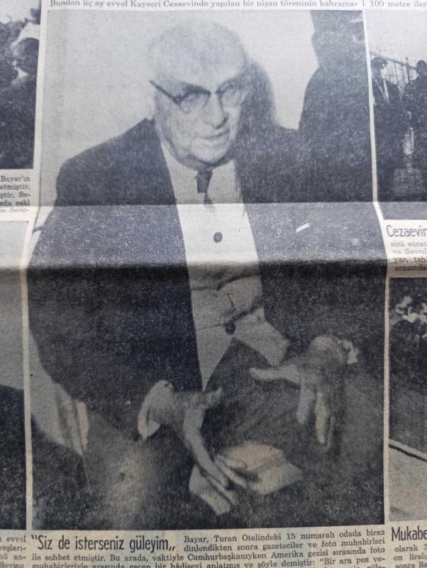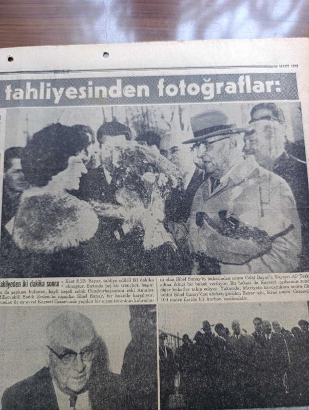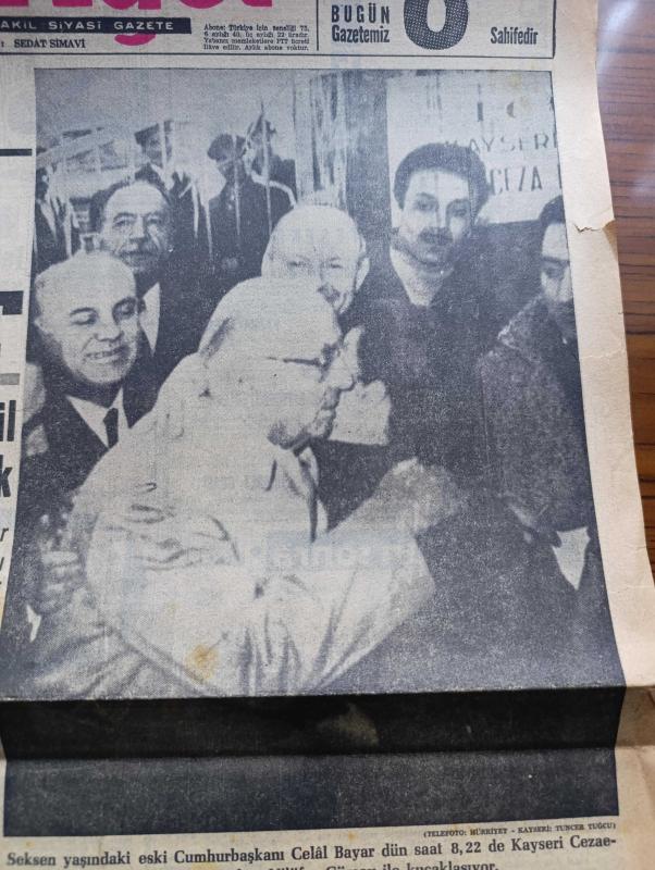 Hürriyet Gazetesi - Turkish Newspaper - 23 Mart 1963 - Celal Bayar serbest - eski Cumhurreisine halk tezahüratta bulundu - 80 yaşındaki eski cumhurbaşkanı Celal Bayar dün saat 8.22'de Kayseri cezaevinden tahliye edildikten sonra kızı Nilüfer Gürsoy ile kucaklaşıyor fotoğraf - Celal Bayar'ın beyanatı - Celal Bayar tam 1029 gün sonra tahliye edildi - İsmet İnönü pazartesiye kadar evinden dışarı çıkmayacak - Mısırla Suriye birleşme konusunda dün anlaştı - telefon davalarına para yatıran avukatlar telaşta - Aşktan sonra yazan İhsan İpekçi Yazı Dizisi - DYO boya - telefunken radyoları - Aygaz - Burç falınız - Canbaba Çizen Sururi - Hüseyin Cahit Yalçın ailesine ait müzayedeyi portakal mobilya evi organize etmekle şeref duyar - Celal Bayar'ın tahliyesinden fotoğraflar - Celal Bayar kaldığı otelin önünde fotoğraf - Celal Bayar Turan oteli'ndeki odasında gazetecilerle sohbet ettikten sonra İbrahim titiz adında berbere tıraş oldu fotoğraf - Sibel Sunay Celal Bayar'a çiçek veriyor fotoğraf, Sedat Simavi tarafından kaleme alınmıştır. Hürriyet Gazetesi - Turkish Newspaper - 23 Mart 1963 - Celal Bayar serbest - eski Cumhurreisine halk tezahüratta bulundu - 80 yaşındaki eski cumhurbaşkanı Celal Bayar dün saat 8.22'de Kayseri cezaevinden tahliye edildikten sonra kızı Nilüfer Gürsoy ile kucaklaşıyor fotoğraf - Celal Bayar'ın beyanatı - Celal Bayar tam 1029 gün sonra tahliye edildi - İsmet İnönü pazartesiye kadar evinden dışarı çıkmayacak - Mısırla Suriye birleşme konusunda dün anlaştı - telefon davalarına para yatıran avukatlar telaşta - Aşktan sonra yazan İhsan İpekçi Yazı Dizisi - DYO boya - telefunken radyoları - Aygaz - Burç falınız - Canbaba Çizen Sururi - Hüseyin Cahit Yalçın ailesine ait müzayedeyi portakal mobilya evi organize etmekle şeref duyar - Celal Bayar'ın tahliyesinden fotoğraflar - Celal Bayar kaldığı otelin önünde fotoğraf - Celal Bayar Turan oteli'ndeki odasında gazetecilerle sohbet ettikten sonra İbrahim titiz adında berbere tıraş oldu fotoğraf - Sibel Sunay Celal Bayar'a çiçek veriyor fotoğraf adlı eser Türkçe dilindedir.