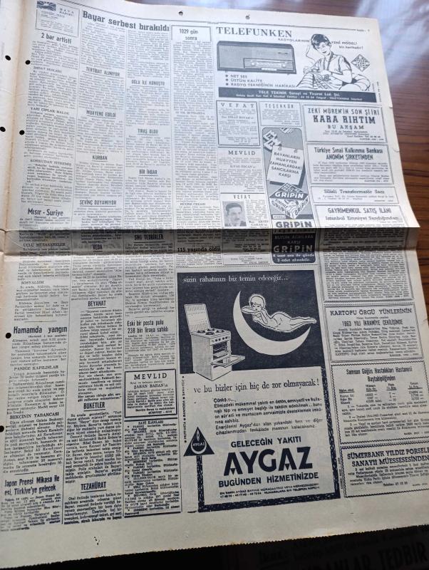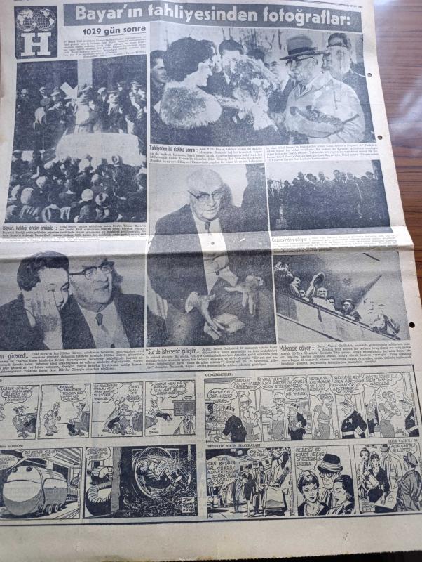 Hürriyet Gazetesi - Turkish Newspaper - 23 Mart 1963 - Celal Bayar serbest - eski Cumhurreisine halk tezahüratta bulundu - 80 yaşındaki eski cumhurbaşkanı Celal Bayar dün saat 8.22'de Kayseri cezaevinden tahliye edildikten sonra kızı Nilüfer Gürsoy ile kucaklaşıyor fotoğraf - Celal Bayar'ın beyanatı - Celal Bayar tam 1029 gün sonra tahliye edildi - İsmet İnönü pazartesiye kadar evinden dışarı çıkmayacak - Mısırla Suriye birleşme konusunda dün anlaştı - telefon davalarına para yatıran avukatlar telaşta - Aşktan sonra yazan İhsan İpekçi Yazı Dizisi - DYO boya - telefunken radyoları - Aygaz - Burç falınız - Canbaba Çizen Sururi - Hüseyin Cahit Yalçın ailesine ait müzayedeyi portakal mobilya evi organize etmekle şeref duyar - Celal Bayar'ın tahliyesinden fotoğraflar - Celal Bayar kaldığı otelin önünde fotoğraf - Celal Bayar Turan oteli'ndeki odasında gazetecilerle sohbet ettikten sonra İbrahim titiz adında berbere tıraş oldu fotoğraf - Sibel Sunay Celal Bayar'a çiçek veriyor fotoğraf adlı eser, Kitap > Süreli Yayınlar > Gazeteler > Türkiye > Genel > Günlük kategorisinde İkinci El olarak satıştadır.