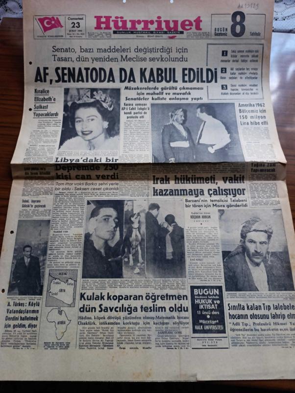Hürriyet Gazetesi - Turkish Newspaper -23 Şubat 1963 -Af senato'da kabul edildi - kraliçe Elizabeth'e suikast yapacaklardı fotoğraf - Asi Kürtlerin lideri molla Mustafa Barzani Irak'ta Abdüsselam Arif hükümeti ile müzakerelere başlamıştır Fotoğrafı - Barzani'nin temsilcisi eski avukatlardan Talabani bir tören için Mısır'a gönderildi fotoğraf - İsmet İnönü Bayramı Gölcük'te geçirecek - Alparslan Türkeş köylü vatandaşlarımın derdini halletmek için geldim dedi Fotoğrafı - sınıfta kalan Tıp talebeleri hocaları Profesör Hikmet Yalgın'ın otosunu tahrip etmiş - kulak koparan matematik öğretmeni Orhan Özaktürk Dün savcılığa teslim oldu Fotoğraf - Amerika 1962 bütçemiz için 150 milyon lira hibe etti - Müzeyyen Senar'ın okuduğu şarap mahzende Odeon plaklarında - sonsuz yol çizen Faruk Geç - İstanbul Ankara Radyosu Programı - burç falı - Yeni Türkiye Partisi büyük Kongresi 14 Mayıs'ta yapılacak - Merih gezegeni ile radar irtibatı kuruldu - Cemal Madanoğlu'nun Alparslan Türkeş hakkında düşünceleri adlı eser, Kitap > Süreli Yayınlar > Gazeteler > Türkiye > Genel > Günlük kategorisinde İkinci El olarak satıştadır.
