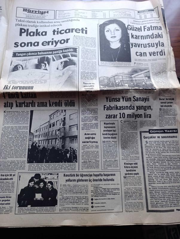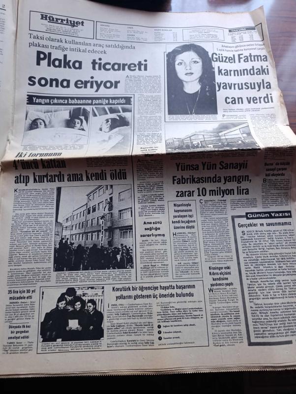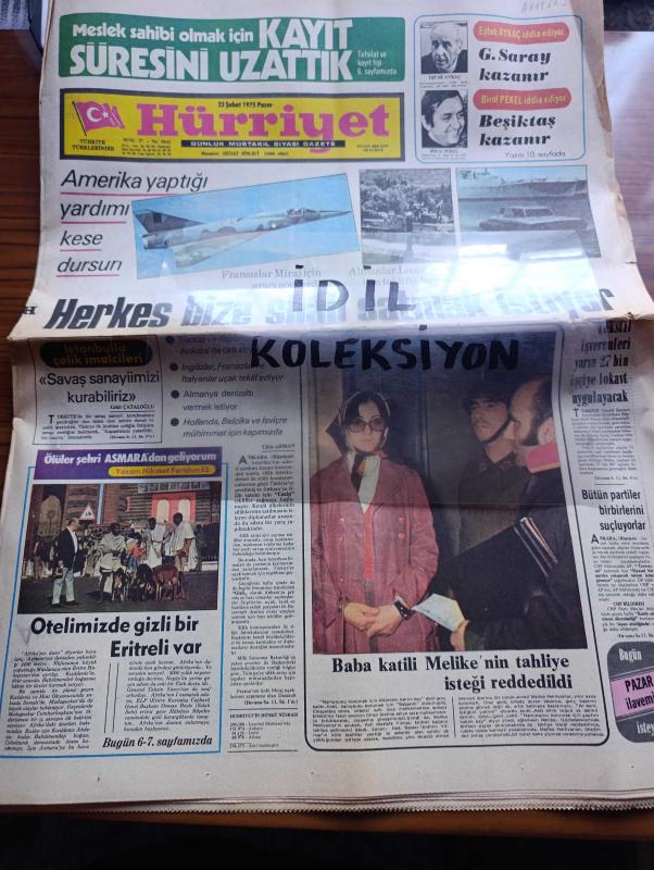 Hürriyet Gazetesi - Turkish Newspaper - 23 Şubat 1975 - Amerika yaptığı yardımı kese dursun herkes bize silah satmak istiyor - Fransızlar Miraj için aracı gönderdi fotoğraf - Almanlar leopar tankı için teklifte bulundu - İstanbullu çelik imalcileri savaş sanayimizi kurabiliriz yazan Cahit Çataloğlu - ölüler şehri Asmara'dan geliyorum yazan Hikmet Feridun Es Yazı Dizisi - tekstil işverenleri yarın 27 bin işçiye lokavt uygulayacak - bütün partiler birbirlerini suçluyor - taksi plakası ticareti sona eriyor - Yünsa yün sanayi fabrikasında yangın zarar 10 milyon lira - Emel Sayın Anne Marie David Ahmet Özhan Bebek Maksimde - Gönül Yazar bebek belediye gazinosunda - Muazzez Abacı Göksel Arsoy Oya Alasya Vatan caddesi turistik Lunapark'ta - şarkıcı Nilüfer ve Nil Burak Playboy'da - Tarkan yazan çizen Sezgin Burak - televizyon programı - 2. Yarının ilk büyük heyecanı Galatasaray Beşiktaş - Galatasaray kazanır çünkü yazan Eşfak Aykaç - Beşiktaş kazanır çünkü yazan Birol Peker - Fenerbahçe adlı eser, Kitap > Süreli Yayınlar > Gazeteler > Türkiye > Genel > Günlük kategorisinde İkinci El olarak satıştadır.