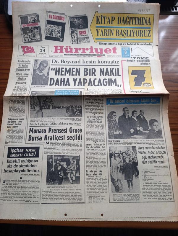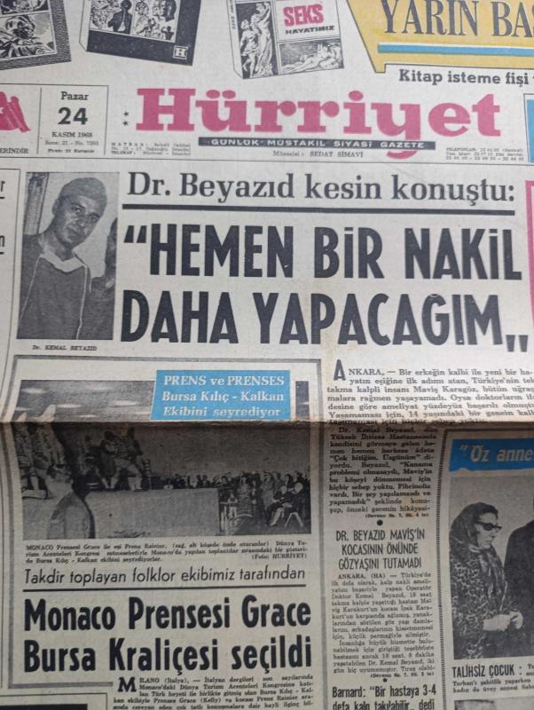 Hürriyet Gazetesi - Turkish Newspaper - 24 Kasım 1968 - Doktor Kemal Beyazıt kesin konuştu hemen bir kalp nakli daha yapacağım - jandarmalar İki kadını öldürdü diyen İnönü olayı meclise götürecek - Monaco prensesi Grace Kelly ile Eşi Prens Rainier Bursa kılıç kalkan ekibini seyrediyor fotoğraf - Doktor Kemal Beyazıt kalp nakli yaptığı Maviş Karagöz'ün kocasının önünde gözyaşını tutamadı - ilk kalp nakli ameliyatını gerçekleştiren Doktor Christian Barnard bir hastaya 3-4 defa kalp takılabilir dedi - Monaco prensesi Grace Kelly Bursa kraliçesi seçildi - Türkiye'den geçecek olan Londra Sidney otomobil maratonu bugün başlıyor - işçiler nasıl emekli olur hazırlayan Metin Soysal - Gönül avcısı yazan ve çizen Faruk Geç - Tarkan Honoriva'nın yüzüğü yazan ve çizen Sezgin Burak - İstanbul Ankara İzmir Radyosu Programı - Yıldırım servis emrinizde - serbest kürsü herkese söz hakkı yöneten Tahsin Öztin - PTT Beşiktaş'ın hattını son anda kesti 1 1 fotoğraf - Fenerbahçe kulübü başkanı Faruk Ilgaz, Sedat Simavi tarafından kaleme alınmıştır. Hürriyet Gazetesi - Turkish Newspaper - 24 Kasım 1968 - Doktor Kemal Beyazıt kesin konuştu hemen bir kalp nakli daha yapacağım - jandarmalar İki kadını öldürdü diyen İnönü olayı meclise götürecek - Monaco prensesi Grace Kelly ile Eşi Prens Rainier Bursa kılıç kalkan ekibini seyrediyor fotoğraf - Doktor Kemal Beyazıt kalp nakli yaptığı Maviş Karagöz'ün kocasının önünde gözyaşını tutamadı - ilk kalp nakli ameliyatını gerçekleştiren Doktor Christian Barnard bir hastaya 3-4 defa kalp takılabilir dedi - Monaco prensesi Grace Kelly Bursa kraliçesi seçildi - Türkiye'den geçecek olan Londra Sidney otomobil maratonu bugün başlıyor - işçiler nasıl emekli olur hazırlayan Metin Soysal - Gönül avcısı yazan ve çizen Faruk Geç - Tarkan Honoriva'nın yüzüğü yazan ve çizen Sezgin Burak - İstanbul Ankara İzmir Radyosu Programı - Yıldırım servis emrinizde - serbest kürsü herkese söz hakkı yöneten Tahsin Öztin - PTT Beşiktaş'ın hattını son anda kesti 1 1 fotoğraf - Fenerbahçe kulübü başkanı Faruk Ilgaz adlı eser Türkçe dilindedir.