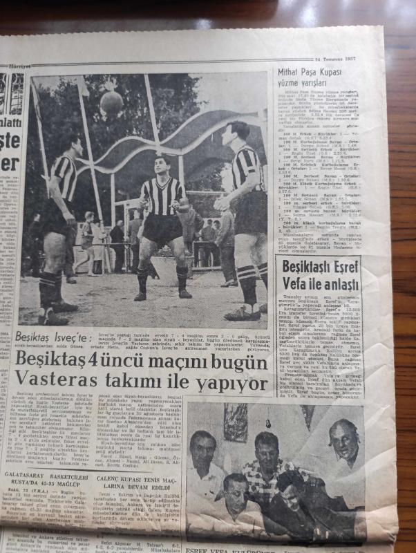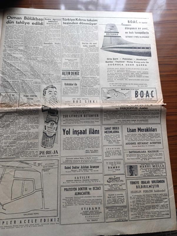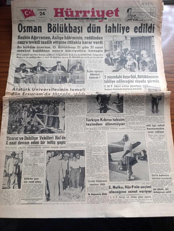 Hürriyet Gazetesi - Turkish Newspaper - 24 Temmuz 1957 - Osman Bölükbaşı Dün tahliye edildi - Osman Bölükbaşı Dün tahliye edildikten sonra Ankara merkez cezaevinin önünde kendisini karşılayanlar arasında fotoğraf - 5 yaşındaki Ayşegül Osman bölükbaşı'nın tahliye edileceğini rüyada görmüş - Keskin ağırcezası Müddeiumumi Lütfü Sağlat aza Halil Özveren Reis Sırrı Kalaycıoğlu ve Aza Nihat Sağın Alp fotoğraf - Atatürk üniversitesinin temeli Dün Erzurum'da törenle atıldı - Reisicumhur Celal Bayar dün gümüş bir pala ile Erzurum'da Atatürk üniversitesinin temeline ilk harcını koyarken yanında Adnan Menderes fotoğraf - dahiliye vekili Namık Gedik dün halde fiyatları tetkik ederken - Türkiye Kıbrıs'ı Taksim tezinden dönmüyor - ikimizin erkeği yazan Vicki Baum Yazı Dizisi - Hürriyet şehitleri için tören yapıldı fotoğraf - Amerikalı iş adamları Ankara'da dün bir basın toplantısı yaptı fotoğraf - Karagöz hokkabaz skeç elektrikli kukla Hakkı Molla - Beşiktaş İsveç'te - 19 Mayıs stadı açılıyor, Sedat Simavi tarafından kaleme alınmıştır. Hürriyet Gazetesi - Turkish Newspaper - 24 Temmuz 1957 - Osman Bölükbaşı Dün tahliye edildi - Osman Bölükbaşı Dün tahliye edildikten sonra Ankara merkez cezaevinin önünde kendisini karşılayanlar arasında fotoğraf - 5 yaşındaki Ayşegül Osman bölükbaşı'nın tahliye edileceğini rüyada görmüş - Keskin ağırcezası Müddeiumumi Lütfü Sağlat aza Halil Özveren Reis Sırrı Kalaycıoğlu ve Aza Nihat Sağın Alp fotoğraf - Atatürk üniversitesinin temeli Dün Erzurum'da törenle atıldı - Reisicumhur Celal Bayar dün gümüş bir pala ile Erzurum'da Atatürk üniversitesinin temeline ilk harcını koyarken yanında Adnan Menderes fotoğraf - dahiliye vekili Namık Gedik dün halde fiyatları tetkik ederken - Türkiye Kıbrıs'ı Taksim tezinden dönmüyor - ikimizin erkeği yazan Vicki Baum Yazı Dizisi - Hürriyet şehitleri için tören yapıldı fotoğraf - Amerikalı iş adamları Ankara'da dün bir basın toplantısı yaptı fotoğraf - Karagöz hokkabaz skeç elektrikli kukla Hakkı Molla - Beşiktaş İsveç'te - 19 Mayıs stadı açılıyor adlı eser Türkçe dilindedir.
