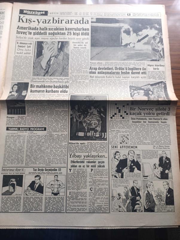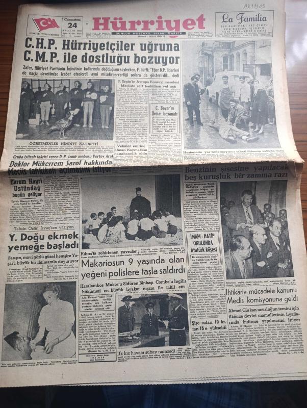 Hürriyet Gazetesi - Turkish Newspaper - 24 aralık 1955 - Cumhuriyet Halk Partisi Hürriyetçiler uğruna Cumhuriyetçi Millet Partisi ile dostluğu bozuyor - öğretmenler hindiyi kaybetti fotoğraf - Celal Bayar'ın Ürdün beyanatı - Dr Mükerrem Sarol meclis tahkikatı açılmasını istiyor - Ekrem Hayri Üstündağ bugün geliyor - Yaşar Doğu ekmek yemeye başladı fotoğraf - Makarios'un 9 yaşında olan yeğeni polislere taşla saldırdı - İmam Hatip okulunda Atatürk köşesi - Şişe suları 10 kuruştan 15'e yükseldi - Dostoyevski'nin kumarbazı gibi biri mahkeme başkatibi kumarın kurbanı oldu - Galata köprüsü'nün tarafında Migros kuruldu fotoğraf - Hitler'i ben yaktım yazan Heinze Linge Yazı Dizisi - Neriman Köksal puro tuvalet sabunu kullanıyor - Edison ampul - Sabite Tur Gönül Yazar Cağaloğlu lokalinde - Müzeyyen Senar bebek bahçesinde - pazar günü Fransa B takımıyla karşılaşacak olan Türk milli futbol takımı Paris'te idman yaptı fotoğraf - Fenerbahçe Beşiktaş maçını Zülbahar Sağnak idare edecek, Sedat Simavi tarafından kaleme alınmıştır. Hürriyet Gazetesi - Turkish Newspaper - 24 aralık 1955 - Cumhuriyet Halk Partisi Hürriyetçiler uğruna Cumhuriyetçi Millet Partisi ile dostluğu bozuyor - öğretmenler hindiyi kaybetti fotoğraf - Celal Bayar'ın Ürdün beyanatı - Dr Mükerrem Sarol meclis tahkikatı açılmasını istiyor - Ekrem Hayri Üstündağ bugün geliyor - Yaşar Doğu ekmek yemeye başladı fotoğraf - Makarios'un 9 yaşında olan yeğeni polislere taşla saldırdı - İmam Hatip okulunda Atatürk köşesi - Şişe suları 10 kuruştan 15'e yükseldi - Dostoyevski'nin kumarbazı gibi biri mahkeme başkatibi kumarın kurbanı oldu - Galata köprüsü'nün tarafında Migros kuruldu fotoğraf - Hitler'i ben yaktım yazan Heinze Linge Yazı Dizisi - Neriman Köksal puro tuvalet sabunu kullanıyor - Edison ampul - Sabite Tur Gönül Yazar Cağaloğlu lokalinde - Müzeyyen Senar bebek bahçesinde - pazar günü Fransa B takımıyla karşılaşacak olan Türk milli futbol takımı Paris'te idman yaptı fotoğraf - Fenerbahçe Beşiktaş maçını Zülbahar Sağnak idare edecek adlı eser Türkçe dilindedir.