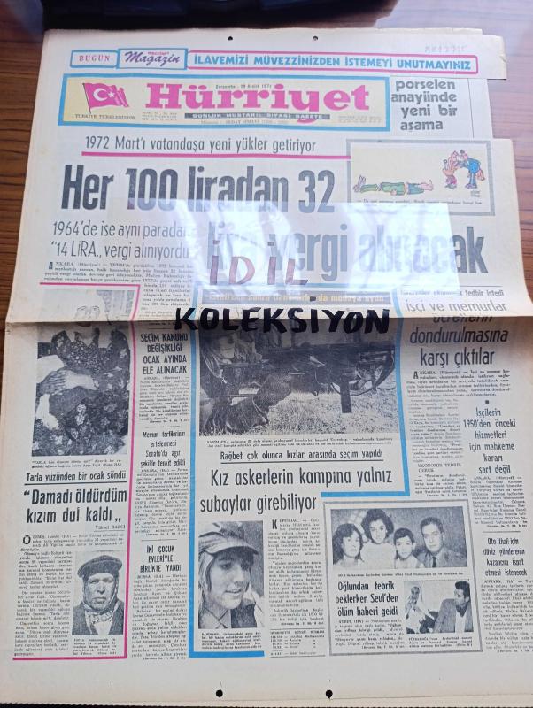 Hürriyet Gazetesi - Turkish Newspaper - 29 Aralık 1971 - 1972 Mart'ı vatandaşa yeni yükler getiriyor - her 100 liradan 32 lira vergi alınacak - 1964'te ise aynı paradan 14 lira vergi alınıyordu - İsrail'den sonra Danimarka'da modaya uydu kız askerler Fotoğrafı - Seul'de hayatını kaybeden kurmay Albay Fazıl Yüzbaşıoğlu eşi ve çocukları ile Fotoğrafı - seçim kanunu değişikliği Ocak ayında ele alınacak - gurbetteki sevgili yazan ve çizen Faruk Geç - İstanbul Ankara İzmir Radyosu Programı - bulmaca - Bingöl Kığı'da deprem 35 aile açıkta kaldı - anneleri hükümlü olan çocuklar gündüz okula gidiyor fotoğraf - otomobil içinde hem yemek yeniyor hem sergi izleniyor Fotoğrafı - Marlene Dietrich 70 yaşında fotoğraflar - 1898 model Renault sergide büyük ilgi gördü Fotoğrafı - aktüel ansiklopedisi - bizimkiler çizen Sezgin Burak - Güngörmüşler karikatür - Dedektif Nik karikatür - Fatoş karikatür - oto ithali için döviz gönderenin kazancını ispat etmesi istenecek - işverenler ekonomik tedbir istedi adlı eser, Kitap > Süreli Yayınlar > Gazeteler > Türkiye > Genel > Günlük kategorisinde İkinci El olarak satıştadır.
