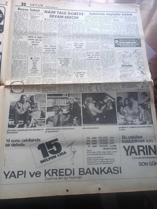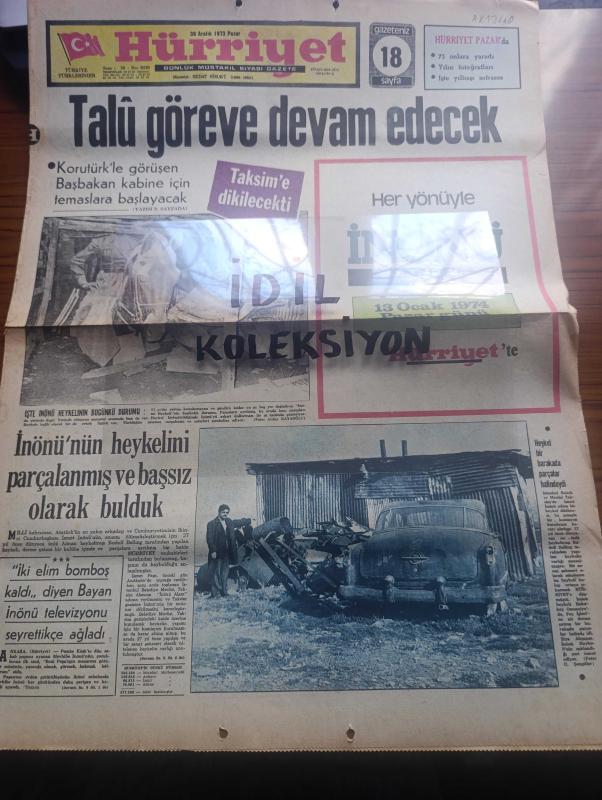 Hürriyet Gazetesi - Turkish Newspaper - 30 Aralık 1973 - Naim Talu başbakanlık görevine devam edecek - Fahri Korutürk'le görüşen Başbakan kabine için temaslara başlayacak - İsmet İnönü'nün heykelini parçalanmış ve başsız olarak bulduk - işte İsmet İnönü heykelinin bugünkü durumu Fotoğrafı - iki elin bomboş kaldı diyen Mevhibe İnönü televizyonu seyrettikçe ağladı - Taksim meydanı'na dikilecek İsmet İnönü heykeli bir barakada parçalar halindeydi Fotoğrafı - bu heykeli dünyaca ünlü heykeltraş Rudolf Belling yapmıştı - Ali Esin'e göre hava durumu - serbest kürsü herkese söz hakkı yöneten Tahsin Öztin - İzmir milletvekili Şinasi Osma üniversite mezunlarına askerlik yapmadan devlet dairesinde iş verilmeli dedi - Paris'te yakalanan 10 Türk'ün kimlikleri hala Türkiye'ye bildirilmedi - Türkiye Halk Kurtuluş Cephesi Savaşçıları - Aydın'da bir belediye başkanlık seçimi iptal edildi 20 kişi gözaltında - Bursa'da bir caddeye İnönü adı verilmesi teklifine AP ve Milli Selamet Partililer karşı çıktı adlı eser, Kitap > Süreli Yayınlar > Gazeteler > Türkiye > Genel > Günlük kategorisinde İkinci El olarak satıştadır.