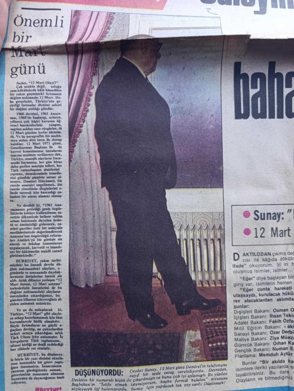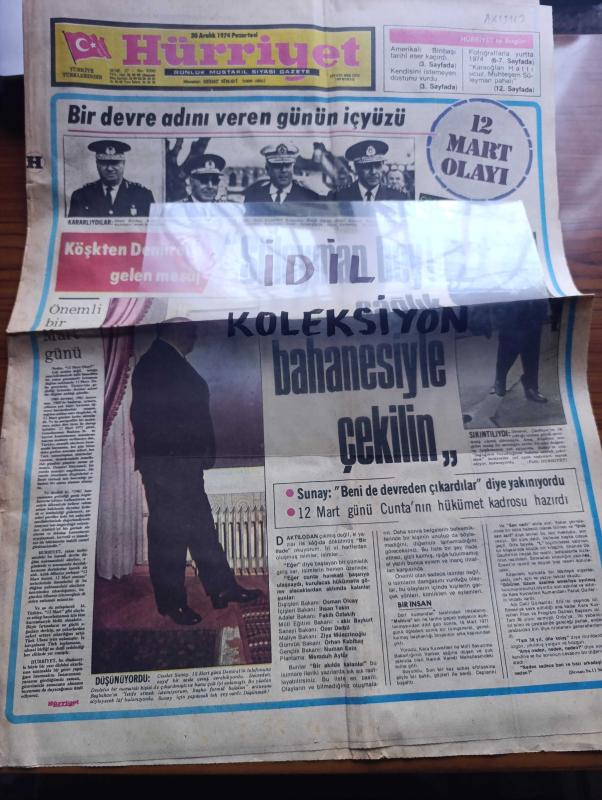 Hürriyet Gazetesi - Turkish Newspaper - 30 Aralık 1974 - Bir devre adını veren günün içyüzü 12 Mart olayı yazan Cüneyt Arcayürek - köşkten Süleyman Demirel'e gelen mesaj Süleyman bey sağlık bahanesiyle çekilin - Süleyman Demirel mesajdan sonra sıkıntılıydı fotoğraf - Genelkurmay Başkanı Memduh Tağmaç'ın ilk imzayı attığı muhtırayı veren komutanlar Faruk Gürler Celal Eyiceoğlu Muhsin Batur fotoğraf - Cevdet Sunay 12 Mart günü Süleyman Demirel'in telefonuna zayıf bir sesle cevap verebiliyordu fotoğraf - 12 Mart günü cuntanın hükümet kadrosu hazırdı - Dışişleri Bakanı Osman Olcay - İçişleri Bakanı İhsan Tekin - Milli Eğitim Bakanı Fakir Baykurt - gümrük bakanı Orhan Kabibay - kapıkule'de sağlanan denge yazan Mete Akyol - Türkiye Garanti Bankası - Yapı ve Kredi Bankası - Almanların yılbaşı içkileri belli oldu Karaoğlan hattı ucuz muhteşem Süleyman pahalı - Almanya'da Hilton otelinde çalışan barmen Hikmet Sertten Türk siyasi hayatından etkilenerek yaptığı kokteyller fotoğraf - Alev Atak, Sedat Simavi tarafından kaleme alınmıştır. Hürriyet Gazetesi - Turkish Newspaper - 30 Aralık 1974 - Bir devre adını veren günün içyüzü 12 Mart olayı yazan Cüneyt Arcayürek - köşkten Süleyman Demirel'e gelen mesaj Süleyman bey sağlık bahanesiyle çekilin - Süleyman Demirel mesajdan sonra sıkıntılıydı fotoğraf - Genelkurmay Başkanı Memduh Tağmaç'ın ilk imzayı attığı muhtırayı veren komutanlar Faruk Gürler Celal Eyiceoğlu Muhsin Batur fotoğraf - Cevdet Sunay 12 Mart günü Süleyman Demirel'in telefonuna zayıf bir sesle cevap verebiliyordu fotoğraf - 12 Mart günü cuntanın hükümet kadrosu hazırdı - Dışişleri Bakanı Osman Olcay - İçişleri Bakanı İhsan Tekin - Milli Eğitim Bakanı Fakir Baykurt - gümrük bakanı Orhan Kabibay - kapıkule'de sağlanan denge yazan Mete Akyol - Türkiye Garanti Bankası - Yapı ve Kredi Bankası - Almanların yılbaşı içkileri belli oldu Karaoğlan hattı ucuz muhteşem Süleyman pahalı - Almanya'da Hilton otelinde çalışan barmen Hikmet Sertten Türk siyasi hayatından etkilenerek yaptığı kokteyller fotoğraf - Alev Atak adlı eser Türkçe dilindedir.