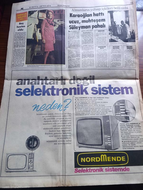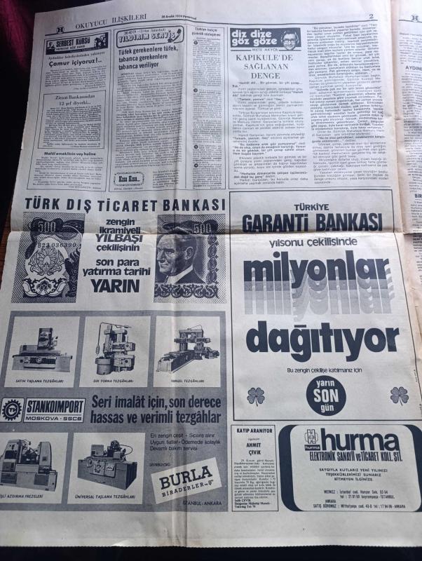 Hürriyet Gazetesi - Turkish Newspaper - 30 Aralık 1974 - Bir devre adını veren günün içyüzü 12 Mart olayı yazan Cüneyt Arcayürek - köşkten Süleyman Demirel'e gelen mesaj Süleyman bey sağlık bahanesiyle çekilin - Süleyman Demirel mesajdan sonra sıkıntılıydı fotoğraf - Genelkurmay Başkanı Memduh Tağmaç'ın ilk imzayı attığı muhtırayı veren komutanlar Faruk Gürler Celal Eyiceoğlu Muhsin Batur fotoğraf - Cevdet Sunay 12 Mart günü Süleyman Demirel'in telefonuna zayıf bir sesle cevap verebiliyordu fotoğraf - 12 Mart günü cuntanın hükümet kadrosu hazırdı - Dışişleri Bakanı Osman Olcay - İçişleri Bakanı İhsan Tekin - Milli Eğitim Bakanı Fakir Baykurt - gümrük bakanı Orhan Kabibay - kapıkule'de sağlanan denge yazan Mete Akyol - Türkiye Garanti Bankası - Yapı ve Kredi Bankası - Almanların yılbaşı içkileri belli oldu Karaoğlan hattı ucuz muhteşem Süleyman pahalı - Almanya'da Hilton otelinde çalışan barmen Hikmet Sertten Türk siyasi hayatından etkilenerek yaptığı kokteyller fotoğraf - Alev Atak adlı eser, Kitap > Süreli Yayınlar > Gazeteler > Türkiye > Genel > Günlük kategorisinde İkinci El olarak satıştadır.