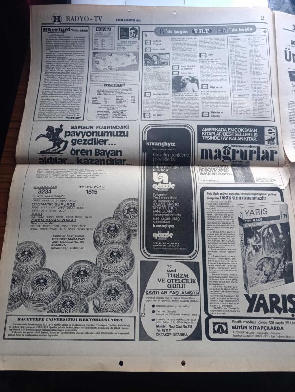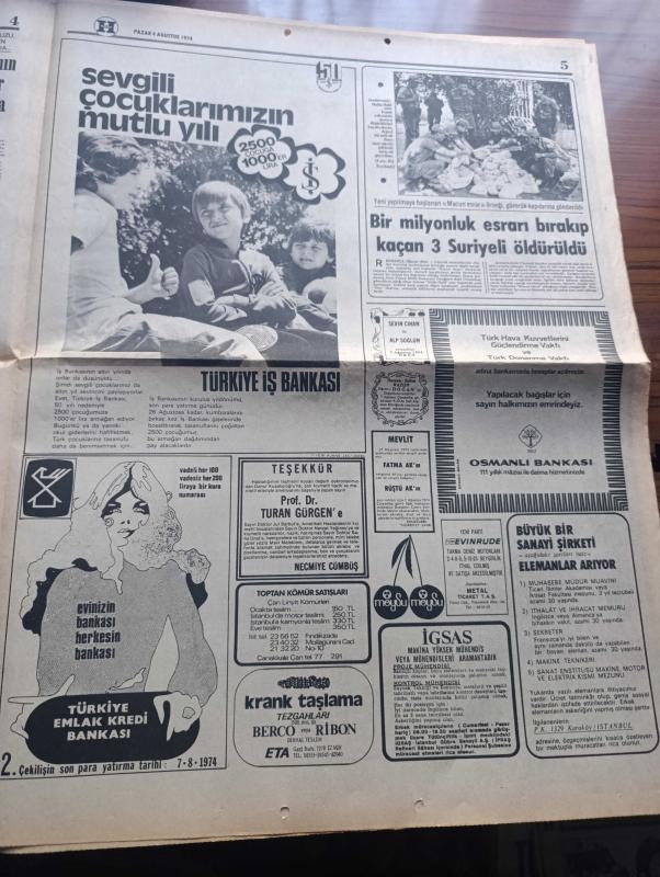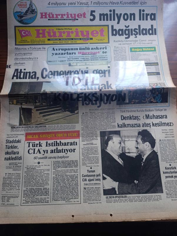 Hürriyet Gazetesi - Turkish Newspaper - 4 Ağustos 1974 - Hürriyet 4 milyonu yeni Yavuz 1 milyonu Hava Kuvvetleri için 5 milyon lira bağışladı - Atina Cenevreyi geri atmak istiyor - Yunan cuntasının şefi CIA ajanıymış - Rauf Denktaş ile Bülent Ecevit 3 defa öpüştüler Fotoğrafı - cumhurbaşkanı Fahri Korutürk komutanlarla yemek yedi - Türk istihbaratı CIA'yı atlatıyor - televizyonda bugün Arsen Lüpen - Türkiye sanayiciler ve İş adamları Derneği Başkanı Feyyaz Berker açıklama yaptı - Çarşamba'nın 4 köyü elektriğe kavuştu - Türkiye İş Bankası - Vakko - 9 sarhoş Erzurum fuarını Teksas'a çevirdi - İskenderun Demir Çelik tesisleri 1975 Ağustosunda işletmeye açılıyor - Bir futbol cinayetinin hikayesi - Altay başkanı Rıdvan Burtecin bu sezon altay'ı zevkle seyredeceksiniz dedi - Şeker Zonguldak maçı 4 dakika eksik oynatılmış bir şampiyonluk elden gidiyor - Beşiktaş'ın en pahalı transferi Sinan Alayoğlu Fotoğrafı - Trabzonspor ilk hazırlık maçını Samsunsporla oynayacak - sıcak savaşın öbür yüzü adlı eser, Kitap > Süreli Yayınlar > Gazeteler > Türkiye > Genel > Günlük kategorisinde İkinci El olarak satıştadır.