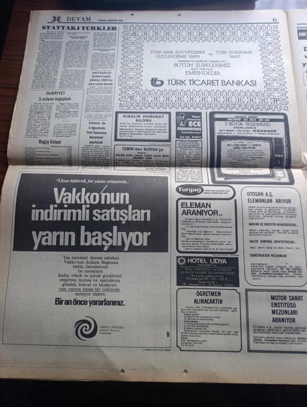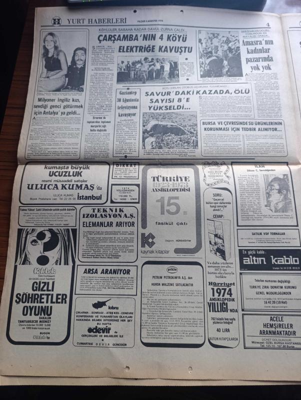 Hürriyet Gazetesi - Turkish Newspaper - 4 Ağustos 1974 - Hürriyet 4 milyonu yeni Yavuz 1 milyonu Hava Kuvvetleri için 5 milyon lira bağışladı - Atina Cenevreyi geri atmak istiyor - Yunan cuntasının şefi CIA ajanıymış - Rauf Denktaş ile Bülent Ecevit 3 defa öpüştüler Fotoğrafı - cumhurbaşkanı Fahri Korutürk komutanlarla yemek yedi - Türk istihbaratı CIA'yı atlatıyor - televizyonda bugün Arsen Lüpen - Türkiye sanayiciler ve İş adamları Derneği Başkanı Feyyaz Berker açıklama yaptı - Çarşamba'nın 4 köyü elektriğe kavuştu - Türkiye İş Bankası - Vakko - 9 sarhoş Erzurum fuarını Teksas'a çevirdi - İskenderun Demir Çelik tesisleri 1975 Ağustosunda işletmeye açılıyor - Bir futbol cinayetinin hikayesi - Altay başkanı Rıdvan Burtecin bu sezon altay'ı zevkle seyredeceksiniz dedi - Şeker Zonguldak maçı 4 dakika eksik oynatılmış bir şampiyonluk elden gidiyor - Beşiktaş'ın en pahalı transferi Sinan Alayoğlu Fotoğrafı - Trabzonspor ilk hazırlık maçını Samsunsporla oynayacak - sıcak savaşın öbür yüzü, Sedat Simavi tarafından kaleme alınmıştır. Hürriyet Gazetesi - Turkish Newspaper - 4 Ağustos 1974 - Hürriyet 4 milyonu yeni Yavuz 1 milyonu Hava Kuvvetleri için 5 milyon lira bağışladı - Atina Cenevreyi geri atmak istiyor - Yunan cuntasının şefi CIA ajanıymış - Rauf Denktaş ile Bülent Ecevit 3 defa öpüştüler Fotoğrafı - cumhurbaşkanı Fahri Korutürk komutanlarla yemek yedi - Türk istihbaratı CIA'yı atlatıyor - televizyonda bugün Arsen Lüpen - Türkiye sanayiciler ve İş adamları Derneği Başkanı Feyyaz Berker açıklama yaptı - Çarşamba'nın 4 köyü elektriğe kavuştu - Türkiye İş Bankası - Vakko - 9 sarhoş Erzurum fuarını Teksas'a çevirdi - İskenderun Demir Çelik tesisleri 1975 Ağustosunda işletmeye açılıyor - Bir futbol cinayetinin hikayesi - Altay başkanı Rıdvan Burtecin bu sezon altay'ı zevkle seyredeceksiniz dedi - Şeker Zonguldak maçı 4 dakika eksik oynatılmış bir şampiyonluk elden gidiyor - Beşiktaş'ın en pahalı transferi Sinan Alayoğlu Fotoğrafı - Trabzonspor ilk hazırlık maçını Samsunsporla oynayacak - sıcak savaşın öbür yüzü adlı eser Türkçe dilindedir.