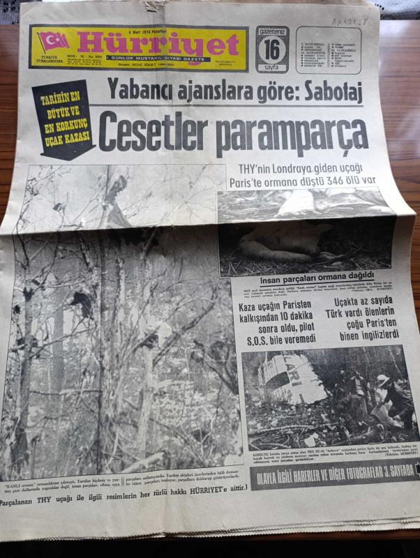 Hürriyet Gazetesi - Turkish Newspaper - 4 Mart 1974 - THY'NİN Londra'ya giden uçağı Paris'te ormana düştü 346 ölü var - tarihin en büyük ve en korkunç uçak kazası - yabancı ajanslara göre sabotaj cesetler paramparça Fotoğrafı - Kanlı orman ormanlıktan çıkmıştı Fotoğrafı - uçakta az sayıda Türk vardı ölenlerin çoğu paris'ten binen ingilizlerdi - korkunç kazada parça parça olan THY DC 10 Ankara uçağından geriye pek bir şey kalmadı Fotoğrafı - THY en güzel elemanları Oral Ulusman Nejat Berköz Ertan Özer ve Hayri Tezcan'ı kaybetti - düşen uçağı kaçıran İngiliz Rugby takımı şampanya içti - yerini başkası alan hostes Ayşen Gigat keşke Ben ölseydim diyor fotoğraf - Bebek Maksimde Behiye Aksoy Ayhan Işık Müjdat Gezen Nil Burak ve Selma Güneri - Gönül Yazar Murat Soydan Ayten Alpman Cilalı İbo Nükhet Duru çakıl gazinosunda - Akbank Kadıköy şubesi açılıyor - Bu da Fenerbahçe'nin Galatasaray'a balyoz gibi yumruğu 2 1 Fotoğrafı - Fenerbahçe'nin feveranı Birch'ün intiharı yazan Gündüz Kılıç, Sedat Simavi tarafından kaleme alınmıştır. Hürriyet Gazetesi - Turkish Newspaper - 4 Mart 1974 - THY'NİN Londra'ya giden uçağı Paris'te ormana düştü 346 ölü var - tarihin en büyük ve en korkunç uçak kazası - yabancı ajanslara göre sabotaj cesetler paramparça Fotoğrafı - Kanlı orman ormanlıktan çıkmıştı Fotoğrafı - uçakta az sayıda Türk vardı ölenlerin çoğu paris'ten binen ingilizlerdi - korkunç kazada parça parça olan THY DC 10 Ankara uçağından geriye pek bir şey kalmadı Fotoğrafı - THY en güzel elemanları Oral Ulusman Nejat Berköz Ertan Özer ve Hayri Tezcan'ı kaybetti - düşen uçağı kaçıran İngiliz Rugby takımı şampanya içti - yerini başkası alan hostes Ayşen Gigat keşke Ben ölseydim diyor fotoğraf - Bebek Maksimde Behiye Aksoy Ayhan Işık Müjdat Gezen Nil Burak ve Selma Güneri - Gönül Yazar Murat Soydan Ayten Alpman Cilalı İbo Nükhet Duru çakıl gazinosunda - Akbank Kadıköy şubesi açılıyor - Bu da Fenerbahçe'nin Galatasaray'a balyoz gibi yumruğu 2 1 Fotoğrafı - Fenerbahçe'nin feveranı Birch'ün intiharı yazan Gündüz Kılıç adlı eser Türkçe dilindedir.