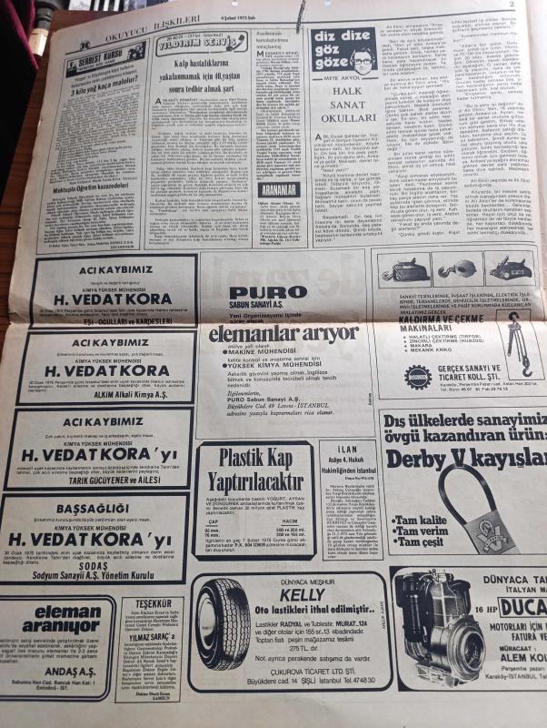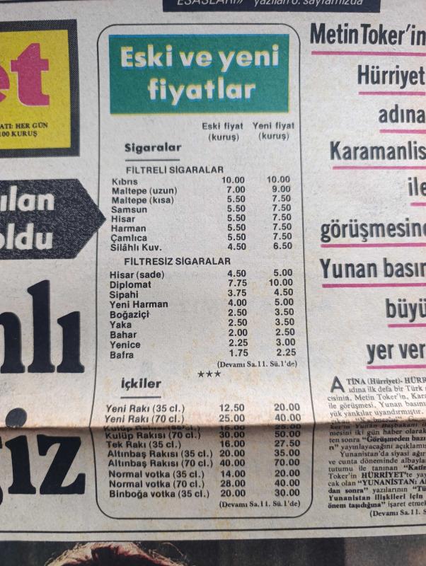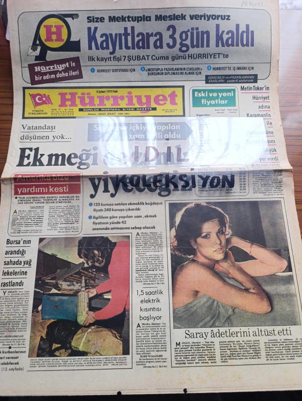 Hürriyet Gazetesi - Turkish Newspaper - 4 Şubat 1975 - sigara ve içkiye yapılan zam belli oldu - ekmeği de zamlı yiyeceğiz - sigaralar filtresiz sigaralar ve içkiler eski ve yeni fiyat karşılaştırması - Metin Toker'in Hürriyet adına Karamanlis ile görüşmesine Yunan basını büyük yer verdi - denize düşen ve dört gündür arama çalışmaları devam eden Bursa yolcu uçağına ait bazı parçalar Karacabey sahilinde bulundu fotoğraf - Monaco'nun genç prensesi Caroline saray adetlerini alt üst etti fotoğraf - Diz Dize göz göze yazan Mete Akyol - gelincik sigarası eski fiyat 1.75 yeni fiyat 2.25 - Birinci sigarası eski fiyat 1.25 yeni fiyat 1.00 - Ankara puro eski fiyat 3.00 yeni fiyat 4.00 - Binboğa votka eski fiyat 40 lira yeni fiyat 60 lira - Farah Diba kayak değil defile yapıyor fotoğraflar - THY'nin F 28 tipi Bursa uçağında hayatını kaybedenlerin aileleri veraset ilamı alabilecek Fotoğrafı - uçak kazasında oğlu Ömer Adula'nın ölümüne üzülen Baba filmi Ferruh Adula kimi kime şikayet edeyim dedi, Sedat Simavi tarafından kaleme alınmıştır. Hürriyet Gazetesi - Turkish Newspaper - 4 Şubat 1975 - sigara ve içkiye yapılan zam belli oldu - ekmeği de zamlı yiyeceğiz - sigaralar filtresiz sigaralar ve içkiler eski ve yeni fiyat karşılaştırması - Metin Toker'in Hürriyet adına Karamanlis ile görüşmesine Yunan basını büyük yer verdi - denize düşen ve dört gündür arama çalışmaları devam eden Bursa yolcu uçağına ait bazı parçalar Karacabey sahilinde bulundu fotoğraf - Monaco'nun genç prensesi Caroline saray adetlerini alt üst etti fotoğraf - Diz Dize göz göze yazan Mete Akyol - gelincik sigarası eski fiyat 1.75 yeni fiyat 2.25 - Birinci sigarası eski fiyat 1.25 yeni fiyat 1.00 - Ankara puro eski fiyat 3.00 yeni fiyat 4.00 - Binboğa votka eski fiyat 40 lira yeni fiyat 60 lira - Farah Diba kayak değil defile yapıyor fotoğraflar - THY'nin F 28 tipi Bursa uçağında hayatını kaybedenlerin aileleri veraset ilamı alabilecek Fotoğrafı - uçak kazasında oğlu Ömer Adula'nın ölümüne üzülen Baba filmi Ferruh Adula kimi kime şikayet edeyim dedi adlı eser Türkçe dilindedir.