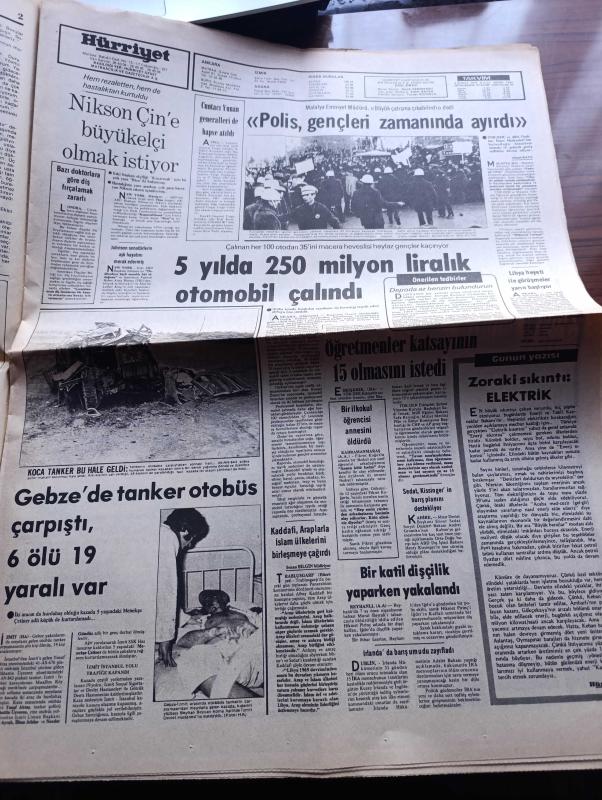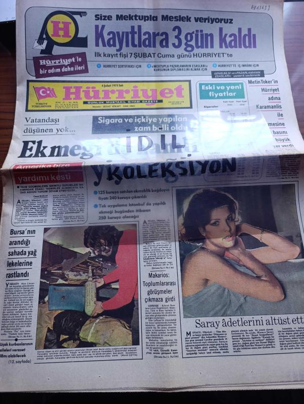 Hürriyet Gazetesi - Turkish Newspaper - 4 Şubat 1975 - sigara ve içkiye yapılan zam belli oldu - ekmeği de zamlı yiyeceğiz - sigaralar filtresiz sigaralar ve içkiler eski ve yeni fiyat karşılaştırması - Metin Toker'in Hürriyet adına Karamanlis ile görüşmesine Yunan basını büyük yer verdi - denize düşen ve dört gündür arama çalışmaları devam eden Bursa yolcu uçağına ait bazı parçalar Karacabey sahilinde bulundu fotoğraf - Monaco'nun genç prensesi Caroline saray adetlerini alt üst etti fotoğraf - gelincik sigarası eski fiyat 1.75 yeni fiyat 2.25 - Birinci sigarası eski fiyat 1.25 yeni fiyat 1.00 - Ankara puro eski fiyat 3.00 yeni fiyat 4.00 - Binboğa votka eski fiyat 40 lira yeni fiyat 60 lira - Farah Diba kayak değil defile yapıyor fotoğraflar - THY'nin F 28 tipi Bursa uçağında hayatını kaybedenlerin aileleri veraset ilamı alabilecek Fotoğrafı - Fenerbahçe antrenörü Didi Cemil Turan'a öğütler veriyor fotoğraf - Beşiktaş kulübü sözcüsü Cengiz Kap ilk üç sıra için gayret edeceğiz dedi adlı eser, Kitap > Süreli Yayınlar > Gazeteler > Türkiye > Genel > Günlük kategorisinde İkinci El olarak satıştadır.