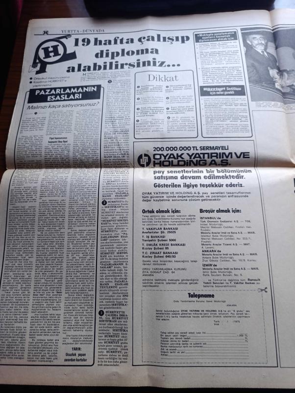 Hürriyet Gazetesi Sayfa Boyutu : 42*58 cm Sayfa Sayısı: 12 Yıpranma, sararmalar, kupon kesiği ve yırtılmalar zamana bağlı olarak görülebilir Not: tam takım gazetedir