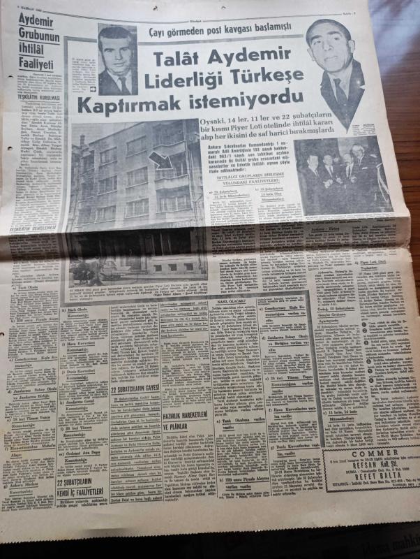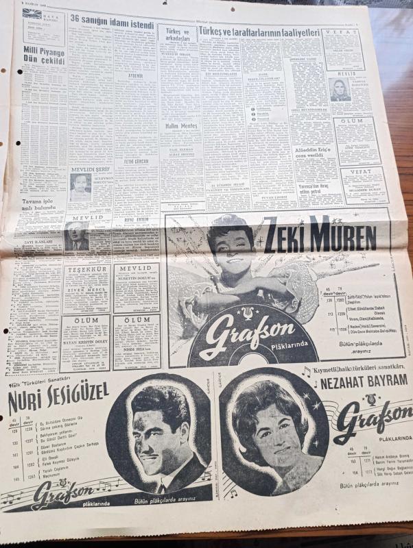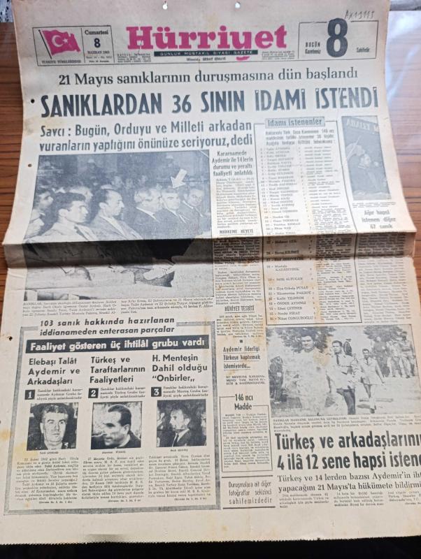Hürriyet Gazetesi - Turkish Newspaper - 8 Haziran 1963 - 21 Mayıs sanıklarının duruşmasına Dün başlandı - sanıklardan 36'sının idamı istendi - savcı bugün orduyu ve milleti arkadan vuranların yaptığını önünüze seriyoruz dedi - Elebaşı Talat Aydemir ve arkadaşları fotoğraf - Alparslan Türkeş ve taraftarlarının faaliyetleri fotoğraf - Halil Menteş'in dahil olduğu onbirler - Alparslan Türkeş ve arkadaşlarının 4 ila 12 sene hapsi istendi - ağır hapsi istenen diğer 67 sanık - idamı istenenler - Talat Aydemir liderliği Alparslan Türkeş'e kaptırmak istemiyordu fotoğraf - Zeki Müren Grafson plaklarında - Zenci Boksör Muhammed Ali'nin imzası müstakbel dünya şampiyonu fotoğraf - Fenerbahçe Hacettepe maçı Dolmabahçe stadı'nda - Beşiktaş İzmirsporla Alsancak'ta oynuyor - Nuri Sesigüzel ve Nezahat Bayram türküleriyle Grafson plaklarında - bir hafta nerede ve kaça kalınır - Çınarcık - Ayvalık - Fatoş karikatür - Gökler Hakimi Gordon karikatür - Dedektif Nik'in Maceraları Karikatür - Mamak, Sedat Simav tarafından kaleme alınmıştır. Hürriyet Gazetesi - Turkish Newspaper - 8 Haziran 1963 - 21 Mayıs sanıklarının duruşmasına Dün başlandı - sanıklardan 36'sının idamı istendi - savcı bugün orduyu ve milleti arkadan vuranların yaptığını önünüze seriyoruz dedi - Elebaşı Talat Aydemir ve arkadaşları fotoğraf - Alparslan Türkeş ve taraftarlarının faaliyetleri fotoğraf - Halil Menteş'in dahil olduğu onbirler - Alparslan Türkeş ve arkadaşlarının 4 ila 12 sene hapsi istendi - ağır hapsi istenen diğer 67 sanık - idamı istenenler - Talat Aydemir liderliği Alparslan Türkeş'e kaptırmak istemiyordu fotoğraf - Zeki Müren Grafson plaklarında - Zenci Boksör Muhammed Ali'nin imzası müstakbel dünya şampiyonu fotoğraf - Fenerbahçe Hacettepe maçı Dolmabahçe stadı'nda - Beşiktaş İzmirsporla Alsancak'ta oynuyor - Nuri Sesigüzel ve Nezahat Bayram türküleriyle Grafson plaklarında - bir hafta nerede ve kaça kalınır - Çınarcık - Ayvalık - Fatoş karikatür - Gökler Hakimi Gordon karikatür - Dedektif Nik'in Maceraları Karikatür - Mamak adlı eser Türkçe dilindedir.