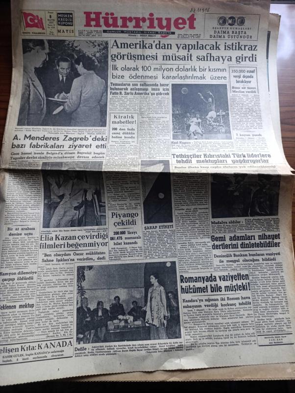 Hürriyet Gazetesi - Turkish Newspaper - 8 Mayıs 1955 - Amerika'dan yapılacak istikraz düşmesi müsait safhaya girdi - Adnan Menderes zagreb'deki bazı fabrikaları ziyaret etti fotoğraf - İngiltere kral kupası 100 bin seyirci önünde Wembley stadı'nda Newcastle United İle Manchester City arasında yapıldı fotoğraf - 350.000 esnaf vergi dışında bırakılıyor - Tedhişciler kıbrıs'taki Türk liderlere tehdit mektupları yağdırıyorlar - emekli binbaşı Şinasi Sükan ve Çavuş Mehmet Ergin Kore'de gösterdikleri yararlılıktan dolayı madalya aldılar fotoğraf - Elia Kazan çevirdiği filmleri beğenmiyor - muslukçular Ramazan faaliyetlerine başladılar - Atatürk kupası'nda Beşiktaş Galatasaray'ı dün 1 0 yendi - Adalet Vefa'yı 4 1 mağlup etti - ilkbahar konkuripik müsabakaları yapıldı - kendi kalemi ile Marilyn Monroe hayatının içyüzünü anlatıyor yazan Marilyn Monroe Yazı Dizisi - yepyeni bir hayat yaşayan Ana kraliçe prenses margaret'ı yanından hiç ayırmıyor - idamdan dört saat evvel filmi Bulvar sinemasında, Sedat Simavi tarafından kaleme alınmıştır. Hürriyet Gazetesi - Turkish Newspaper - 8 Mayıs 1955 - Amerika'dan yapılacak istikraz düşmesi müsait safhaya girdi - Adnan Menderes zagreb'deki bazı fabrikaları ziyaret etti fotoğraf - İngiltere kral kupası 100 bin seyirci önünde Wembley stadı'nda Newcastle United İle Manchester City arasında yapıldı fotoğraf - 350.000 esnaf vergi dışında bırakılıyor - Tedhişciler kıbrıs'taki Türk liderlere tehdit mektupları yağdırıyorlar - emekli binbaşı Şinasi Sükan ve Çavuş Mehmet Ergin Kore'de gösterdikleri yararlılıktan dolayı madalya aldılar fotoğraf - Elia Kazan çevirdiği filmleri beğenmiyor - muslukçular Ramazan faaliyetlerine başladılar - Atatürk kupası'nda Beşiktaş Galatasaray'ı dün 1 0 yendi - Adalet Vefa'yı 4 1 mağlup etti - ilkbahar konkuripik müsabakaları yapıldı - kendi kalemi ile Marilyn Monroe hayatının içyüzünü anlatıyor yazan Marilyn Monroe Yazı Dizisi - yepyeni bir hayat yaşayan Ana kraliçe prenses margaret'ı yanından hiç ayırmıyor - idamdan dört saat evvel filmi Bulvar sinemasında adlı eser Türkçe dilindedir.