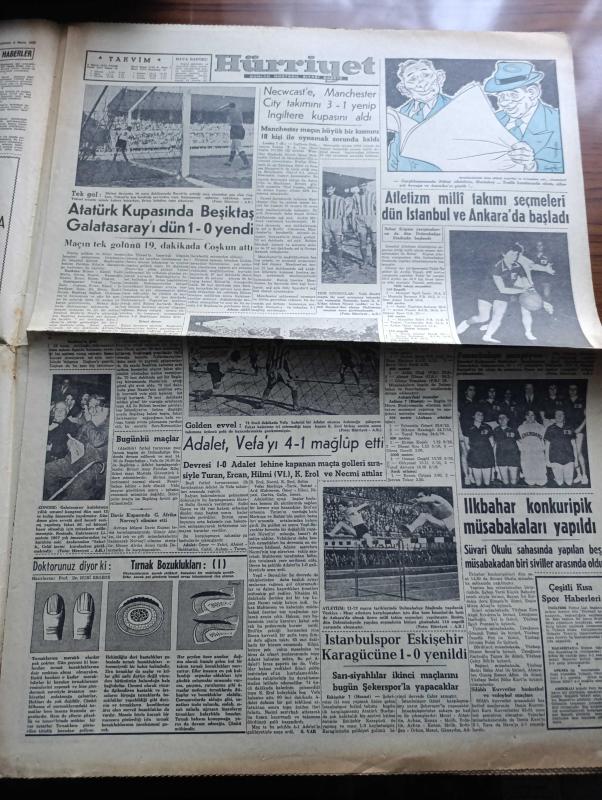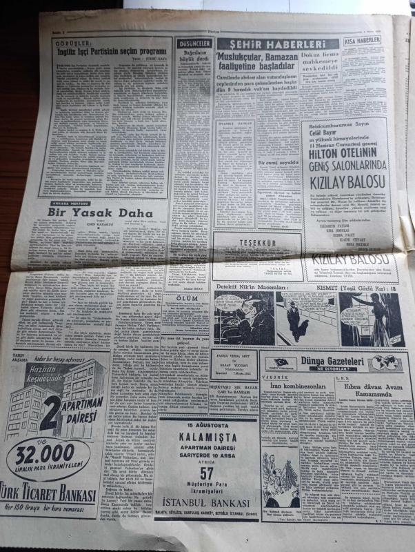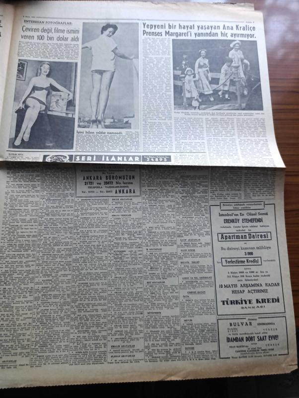 Hürriyet Gazetesi - Turkish Newspaper - 8 Mayıs 1955 - Amerika'dan yapılacak istikraz düşmesi müsait safhaya girdi - Adnan Menderes zagreb'deki bazı fabrikaları ziyaret etti fotoğraf - İngiltere kral kupası 100 bin seyirci önünde Wembley stadı'nda Newcastle United İle Manchester City arasında yapıldı fotoğraf - 350.000 esnaf vergi dışında bırakılıyor - Tedhişciler kıbrıs'taki Türk liderlere tehdit mektupları yağdırıyorlar - emekli binbaşı Şinasi Sükan ve Çavuş Mehmet Ergin Kore'de gösterdikleri yararlılıktan dolayı madalya aldılar fotoğraf - Elia Kazan çevirdiği filmleri beğenmiyor - muslukçular Ramazan faaliyetlerine başladılar - Atatürk kupası'nda Beşiktaş Galatasaray'ı dün 1 0 yendi - Adalet Vefa'yı 4 1 mağlup etti - ilkbahar konkuripik müsabakaları yapıldı - kendi kalemi ile Marilyn Monroe hayatının içyüzünü anlatıyor yazan Marilyn Monroe Yazı Dizisi - yepyeni bir hayat yaşayan Ana kraliçe prenses margaret'ı yanından hiç ayırmıyor - idamdan dört saat evvel filmi Bulvar sinemasında adlı eser, Kitap > Süreli Yayınlar > Gazeteler > Türkiye > Genel > Günlük kategorisinde İkinci El olarak satıştadır.
