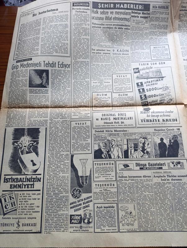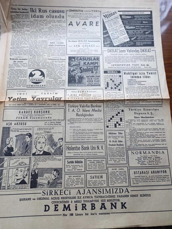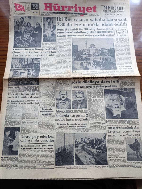 Hürriyet Gazetesi - Turkish Newspaper - 9 Mart 1955 - iki Rus casusu Ivan Adamidi ile Nikolay Antonof sabaha karşı 2.30'da Erzurum'da idam edildi - Londra büyükelçimiz Hikmet Baydur'un cenazesi Fotoğrafı - kadınları koruma derneği faaliyette genç bir kadını sokaktan kurtarıp himayelerini aldılar fotoğraf - Türklüğü tahkir iddiası ile Tevkif edilen doktor Horhoroni - Hıfzı Oğuz Nihat Erimi yeniden sözle düello'ya davet etti - Celal Bayar'ın Bağdat'ta 4. Günü - İzmir'de NATO karargahında çıkan yangın - grip medeniyeti tehdit ediyor - dünya gazeteleri ne diyor - Aşk arzusu çizen Faruk Geç - yetim yavrular filmi başrolde Eşref Kolaç Muhterem Nur İnci ve Taksim sinemasında - avare filmi Çemberlitaş ve yeni sinemada - kardeş kurşunu filmi başrolde Ayhan Işık Turan Seyfioğlu ferah sinemasında - Yunan aşk ilahesi Afrodit'i canlandıran Hilary Firmin Fotoğrafı - seyyar sirklerin kış çalışması Fotoğrafı - İstanbul Ankara Radyosu Programı - Gökler Hakimi Gordon karikatür - Fatoş karikatür adlı eser, Kitap > Süreli Yayınlar > Gazeteler > Türkiye > Genel > Günlük kategorisinde İkinci El olarak satıştadır.