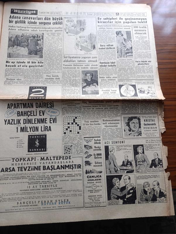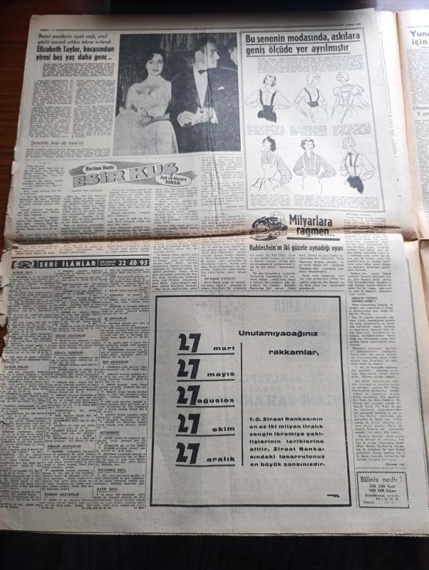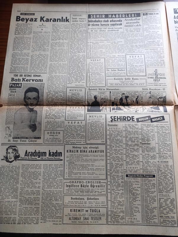 Hürriyet Gazetesi - Turkish Newspaper - 9 Şubat 1957 - Yunanistan Kıbrıs için yine atıp tutuyor - Rusya ve peyklerin pazarlık teklifini reddettiğini bildiren Yunanistan batılıların yardımını istedi - tokyo'ya ilk bombayı atan Amerikalı pilot General Doolittle fotoğraf - Osman Bölükbaşı dün yaptığı 35 dakikalık hasbihal sırasında fotoğraf - başvekili Adnan Menderes'in izahatını Fethi Çelikbaş cevap verdi - Türkiye'de petrol aramakta olan şirketler 12'ye yükseldi - devamlı sise rağmen İstanbul dün bir Aralık Bahar havasına büründü fotoğraf - edebi sohbetler yazan Nihat Sami Banarlı - Dolmabahçe stadı arkasında bir yüzme havuzu yapılacak - Bursa'da volfram madeni işletilecek - Perihan Altındağ Sözeri kristal gazinosu'nda - aşk ve macera romanı esir kuş yazan Kerime Nadir yazı dizisi - Sabite Tur bebek Gazinosunda - Lig lideri Galatasaray lig sonuncusu Beyoğlusporla saat 14.45'te oynuyor fotoğraf - Karagümrük Eyüp bugün oynuyorlar - Federasyon Kupası voleybol maçları -Fenerbahçe'nin maçı adlı eser, Kitap > Süreli Yayınlar > Gazeteler > Türkiye > Genel > Günlük kategorisinde İkinci El olarak satıştadır.