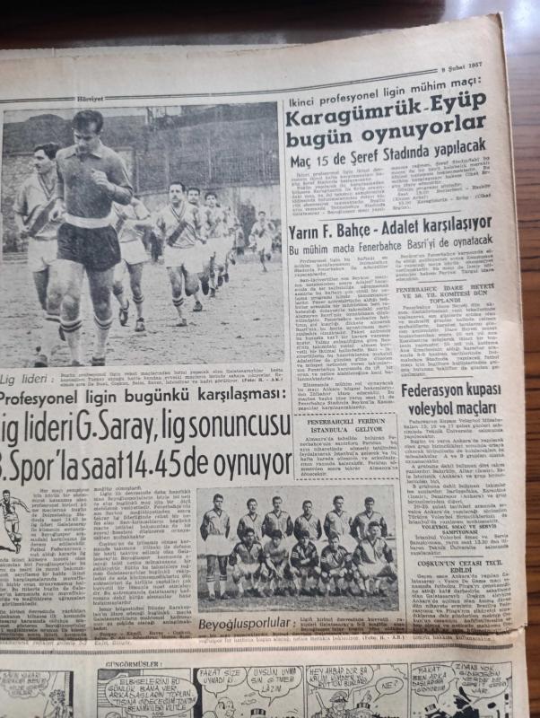 Hürriyet Gazetesi - Turkish Newspaper - 9 Şubat 1957 - Yunanistan Kıbrıs için yine atıp tutuyor - Rusya ve peyklerin pazarlık teklifini reddettiğini bildiren Yunanistan batılıların yardımını istedi - tokyo'ya ilk bombayı atan Amerikalı pilot General Doolittle fotoğraf - Osman Bölükbaşı dün yaptığı 35 dakikalık hasbihal sırasında fotoğraf - başvekili Adnan Menderes'in izahatını Fethi Çelikbaş cevap verdi - Türkiye'de petrol aramakta olan şirketler 12'ye yükseldi - devamlı sise rağmen İstanbul dün bir Aralık Bahar havasına büründü fotoğraf - edebi sohbetler yazan Nihat Sami Banarlı - Dolmabahçe stadı arkasında bir yüzme havuzu yapılacak - Bursa'da volfram madeni işletilecek - Perihan Altındağ Sözeri kristal gazinosu'nda - aşk ve macera romanı esir kuş yazan Kerime Nadir yazı dizisi - Sabite Tur bebek Gazinosunda - Lig lideri Galatasaray lig sonuncusu Beyoğlusporla saat 14.45'te oynuyor fotoğraf - Karagümrük Eyüp bugün oynuyorlar - Federasyon Kupası voleybol maçları -Fenerbahçe'nin maçı, Sedat Simavi tarafından kaleme alınmıştır. Hürriyet Gazetesi - Turkish Newspaper - 9 Şubat 1957 - Yunanistan Kıbrıs için yine atıp tutuyor - Rusya ve peyklerin pazarlık teklifini reddettiğini bildiren Yunanistan batılıların yardımını istedi - tokyo'ya ilk bombayı atan Amerikalı pilot General Doolittle fotoğraf - Osman Bölükbaşı dün yaptığı 35 dakikalık hasbihal sırasında fotoğraf - başvekili Adnan Menderes'in izahatını Fethi Çelikbaş cevap verdi - Türkiye'de petrol aramakta olan şirketler 12'ye yükseldi - devamlı sise rağmen İstanbul dün bir Aralık Bahar havasına büründü fotoğraf - edebi sohbetler yazan Nihat Sami Banarlı - Dolmabahçe stadı arkasında bir yüzme havuzu yapılacak - Bursa'da volfram madeni işletilecek - Perihan Altındağ Sözeri kristal gazinosu'nda - aşk ve macera romanı esir kuş yazan Kerime Nadir yazı dizisi - Sabite Tur bebek Gazinosunda - Lig lideri Galatasaray lig sonuncusu Beyoğlusporla saat 14.45'te oynuyor fotoğraf - Karagümrük Eyüp bugün oynuyorlar - Federasyon Kupası voleybol maçları -Fenerbahçe'nin maçı adlı eser Türkçe dilindedir.