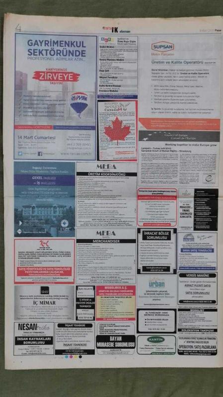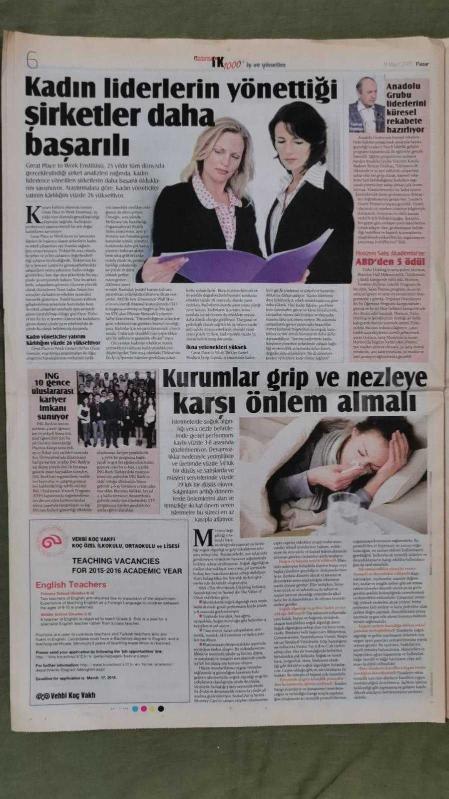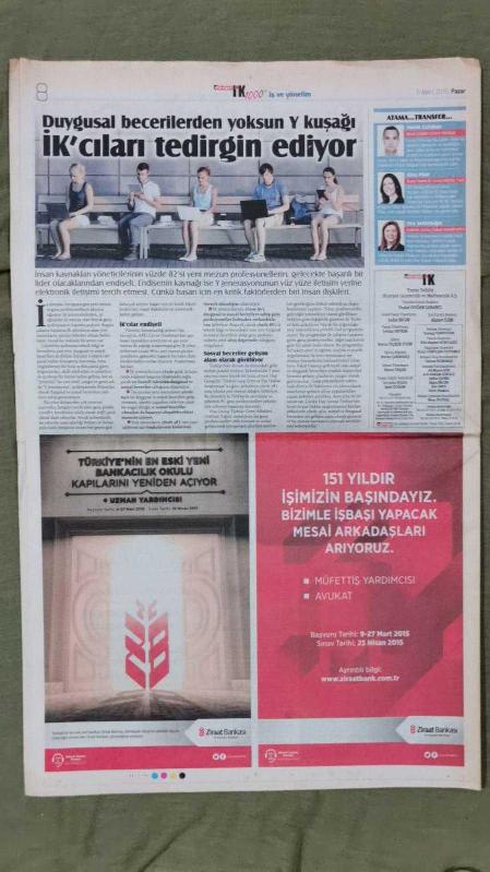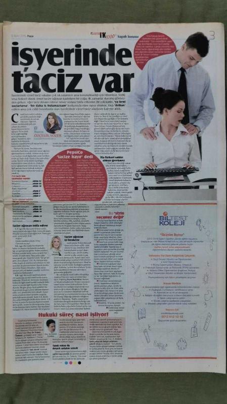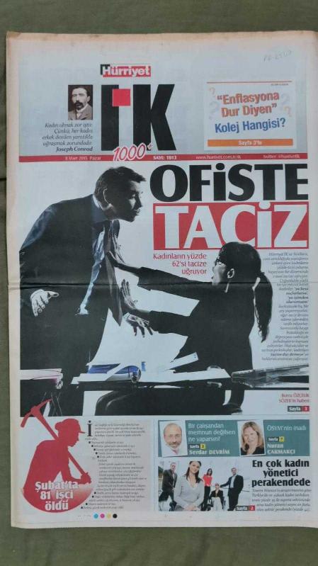 Kitap 2015 yılında yayınlanmıştır. 8 sayfadır. Hürriyet İ K Gazete 8 Mart 2015 Ofiste Taciz,En Çok Kadın Yönetici Perakendede,Şubat'ta 81 İşçi Öldü,Kadın Liderlerin Yönettiği Şirketler Daha Başarılı,Ziraat Bankası - Uğur Koleji - Garanti - Biltest Reklamı adlı eser Türkçe dilindedir.