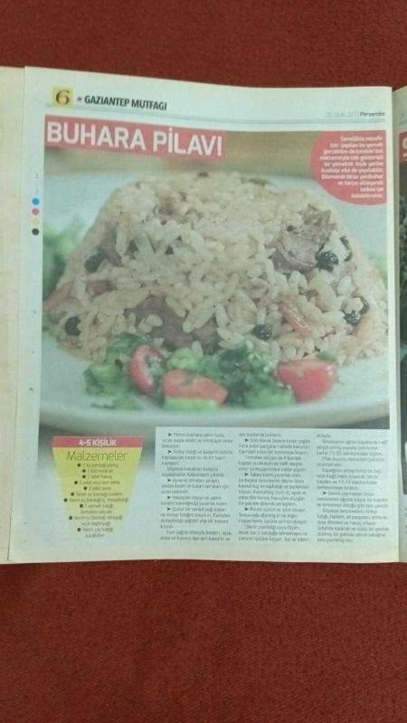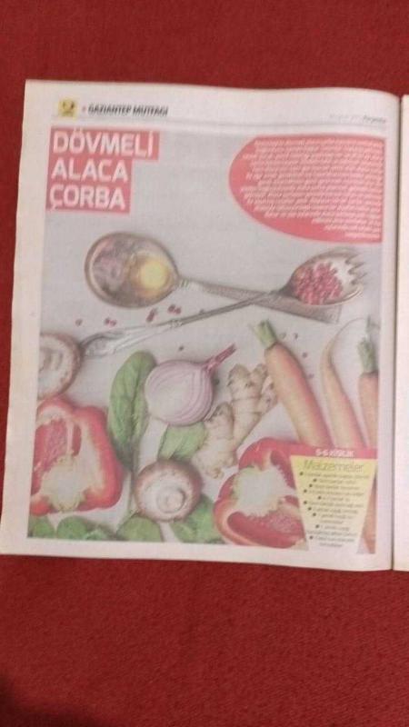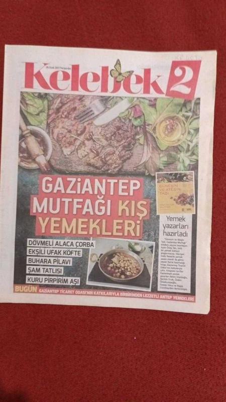 Kitap 2017 yılında yayınlanmıştır. 8 sayfadır. Hürriyet Kelebek 2 Gazete 26 Ocak 2017 Gaziantep Mutfağı Kış Yemekleri,Dövmeli Alaca Çorba Tarifi,Ekşili Ufak Köfte Tarifi,Buhara Pilavı Tarifi,Şam Tatlısı Tarifi,Kuru Pirpirim Aşı Tarifi adlı eser Türkçe dilindedir.