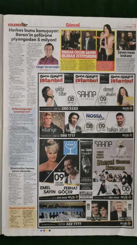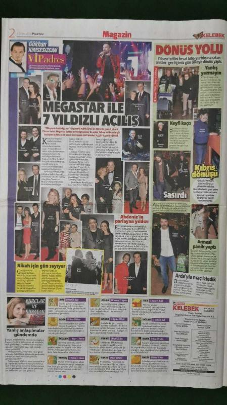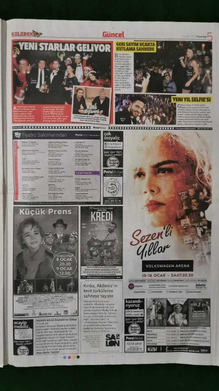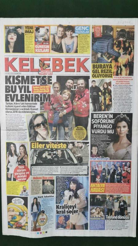Kitap 2016 yılında yayınlanmıştır. 6 sayfadır. Hürriyet Kelebek Gazete 4 Ocak 2016 Derye Şensoy,Meriç Aral,Merve Boluğur,Murat Kasabova,Yeşim Salkım,Tarkan,Beren Saat,Elif Ece Uzun,Simge Tertemiz,Burak Özçivit,Fahriye Evcen,Hande Yener,Serdar Ortaç,Deniz Akkaya,Erdem Yener,Onur Buldu,Burak Topaloğlu,Behzat Gerçeker,Gülşen,Can Gürzap,Selçuk Yöntem,Beyazıt Öztürk,Otel - Gazino Reklamları adlı eser Türkçe dilindedir.