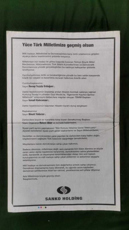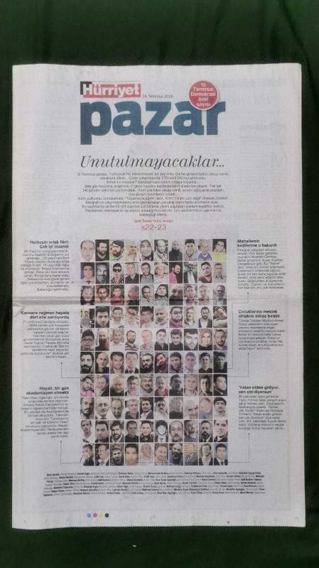 Kitap 2016 yılında yayınlanmıştır. 30 sayfadır. Hürriyet Pazar Gazete 24 Temmuz 2016 Unutulmayacaklar,Hande Fırat,Ece Taşpınar,Serpin Sükan,Ceyda Balaban,Ayşe Kulin,Metin Fadıllıoğlu,Bülent Arınç,Nina Agdal,Vincent Van Gogh,Taylor Swift,Hakkı Bulut,Levent Bektaş,Fetullah Gülen,Boyner Grup - Emlak Konut - Sanko Holding - LC Waikiki - Hitay - Ziylan - Demokrasi Afişi adlı eser Türkçe dilindedir.