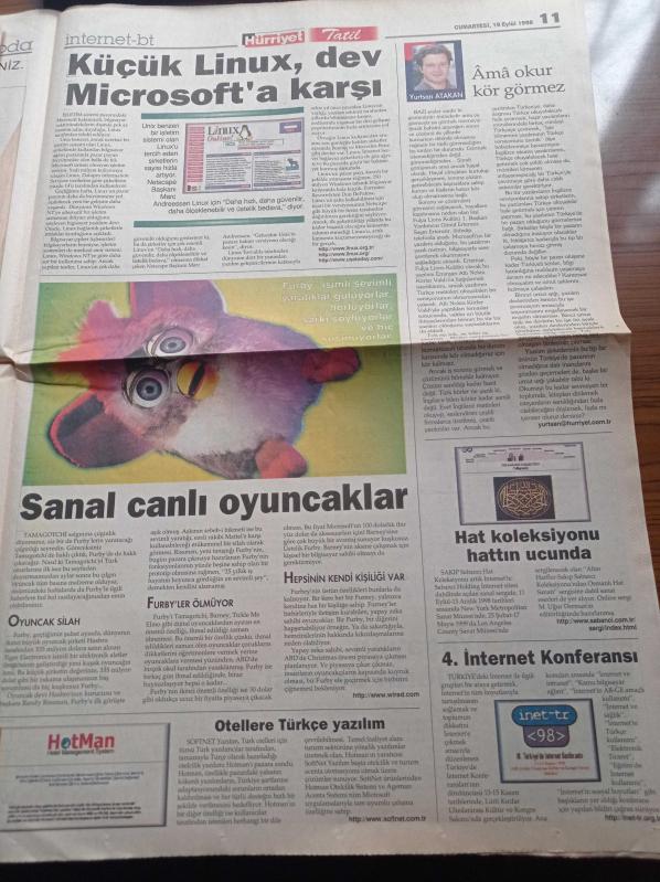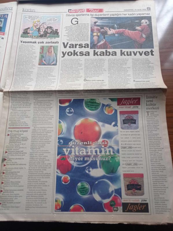 Hürriyet Tatil Gazetesi - 19 Eylül 1998 - Hande Ataizi - Cem Davran - İlk Kez Yapılacak Yapılacak Avrupa Kick Boxing Şampiyonasi- Kick Boxing Dünya Üçüncü Kıymet Karpuzoğlu - Kaybolan Selanikli Cemaatinin Konuşan Tanığı Ilgaz Zorlu - Bill Clinton Monica Lewinsky İlişkisi- Seçmen Avı Başlıyor - Serdar Turgut - New York Times'a Saldırı - Sanki Tiyatro Sahnesi - Konniçiva Tokyo'dan Sevgiler - Kahvaltı Et Notunu Yükselt adlı eser Türkçe dilindedir.