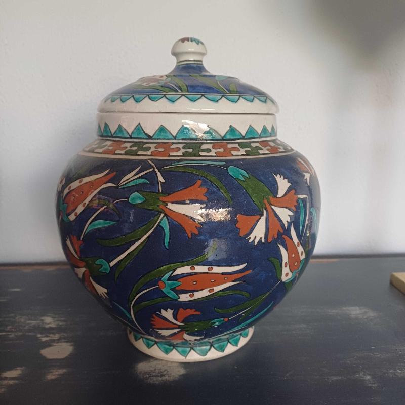 El boyama seramik vazo/kavanoz/Bal küpü vintage. Kusursuz kondisyon. Mukemmel El sanati. Geleneksel Cini sanati motifleri ve muazzam renkleri ile gercek bir değer. Geniş ,yayvan form. Klasik lale ve karanfil bezemeleri. Yukseklik 27 cm Agiz capi 14 cm Genislik 26 cm
