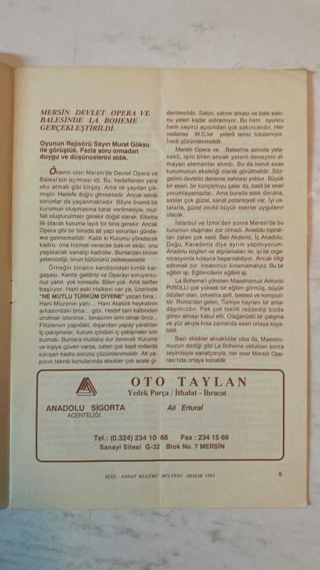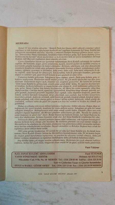 İÇEL SANAT KULÜBÜ AYLIK BÜLTENİ DERGİSİ - ARALIK 1993 SAYI: 20 FAZIL TÜTÜNER - MURAT GÖKSU - ANTONIO PIROLLI - SERRA DURUGÖNÜL - DOĞAN AKÇA - M. ALİ MERİÇ - NİSA KADİBEŞEGİL - HAMİDE AKATA - MÜBERRA ANAMUR - ÖMER ANAMUR - M. ALİ SULUTAŞ MERSİN DEVLET OPERA VE BALESİ'NDE LA BOHEME - KİLİKYA'DA BİR ATHENA PARTHENOS - BÖLGEDE KÜLTÜR SANAT VE DOĞA ETKİNLİKLERİ - SERGİLER - OPERA BALE PROGRAMI - DOĞAN AKÇA RESİM ATÖLYESİ - HOLLANDA GEZİSİ DİA GÖSTERİSİ - KUYULUK GEZİSİ - TÜTÜNSÜZ BİR DÜNYA İÇİN ELELE - BİR GARİP YAĞMUR DUASI - ÖĞRETMEN - ZEHRA SAY - MERSİN DEVLET OPERA VE BALESİ - KENTLERİMİZE ÖNCE MİMARLAR SAHİP ÇIKMALI - AYIN PROGRAMI - HİKMET ŞİMŞEK İLE BİR GÜZEL GÜN - YAZDAN KALAN NOTLAR - AKKAHVE’NİN SANATÇILARI - MERSİN’DE EDEBİYATÇI VE EDEBİYATÇILAR - ÇAMLIBEL'DE BİR KONAK VARDI - 70. YIL GÖKKÜŞAĞI İÇEL SANAT KULÜBÜ - SEMİHİ VURAL - KİLİKYA'DA BİR ATHENA PARTHENOS - LEVENT ZOROĞLU - AYDINLAR ÜSTÜNE, HİKMET ERGUN - SAHİP ÇIKMANIN BÖYLESİ- REMZİYE ERYILMAZ - TAM TAKIM EKSİKSİZ 36 SAYFA, FAZIL TÜTÜNER tarafından kaleme alınmıştır. Eser BÜLENT AKBAŞ editörlüğünde hazırlanmıştır. Kitap . tarafından yayınlanmıştır. 36 sayfadır. İÇEL SANAT KULÜBÜ AYLIK BÜLTENİ DERGİSİ - ARALIK 1993 SAYI: 20 FAZIL TÜTÜNER - MURAT GÖKSU - ANTONIO PIROLLI - SERRA DURUGÖNÜL - DOĞAN AKÇA - M. ALİ MERİÇ - NİSA KADİBEŞEGİL - HAMİDE AKATA - MÜBERRA ANAMUR - ÖMER ANAMUR - M. ALİ SULUTAŞ MERSİN DEVLET OPERA VE BALESİ'NDE LA BOHEME - KİLİKYA'DA BİR ATHENA PARTHENOS - BÖLGEDE KÜLTÜR SANAT VE DOĞA ETKİNLİKLERİ - SERGİLER - OPERA BALE PROGRAMI - DOĞAN AKÇA RESİM ATÖLYESİ - HOLLANDA GEZİSİ DİA GÖSTERİSİ - KUYULUK GEZİSİ - TÜTÜNSÜZ BİR DÜNYA İÇİN ELELE - BİR GARİP YAĞMUR DUASI - ÖĞRETMEN - ZEHRA SAY - MERSİN DEVLET OPERA VE BALESİ - KENTLERİMİZE ÖNCE MİMARLAR SAHİP ÇIKMALI - AYIN PROGRAMI - HİKMET ŞİMŞEK İLE BİR GÜZEL GÜN - YAZDAN KALAN NOTLAR - AKKAHVE’NİN SANATÇILARI - MERSİN’DE EDEBİYATÇI VE EDEBİYATÇILAR - ÇAMLIBEL'DE BİR KONAK VARDI - 70. YIL GÖKKÜŞAĞI İÇEL SANAT KULÜBÜ - SEMİHİ VURAL - KİLİKYA'DA BİR ATHENA PARTHENOS - LEVENT ZOROĞLU - AYDINLAR ÜSTÜNE, HİKMET ERGUN - SAHİP ÇIKMANIN BÖYLESİ- REMZİYE ERYILMAZ - TAM TAKIM EKSİKSİZ 36 SAYFA adlı eser Türkçe dilindedir.