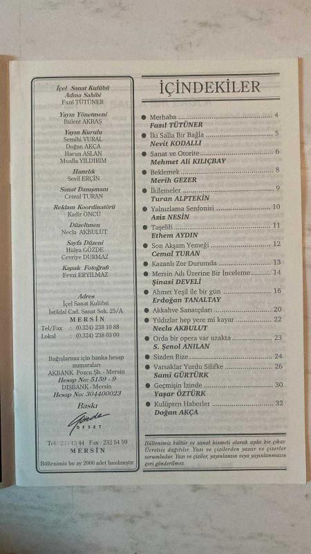 İÇEL SANAT KULÜBÜ AYLIK BÜLTENİ DERGİSİ - TEMMUZ - AĞUSTOS 1996 SAYI: 49-50 FAZIL TÜTÜNER - BÜLENT AKBAŞ - SEMİHİ VURAL - DOĞAN AKÇA - HARUN ASLAN - MUALLA YILDIRIM - SEVİL ERÇİN - CEMAL TURAN - KADİR ÖNCÜ - NECLA AKBULUT - HÜLYA GÖZDE - CEVRİYE DURMAZ - FEVZİ ERYILMAZ NEVİT KODALLI - MEHMET ALİ KILIÇBAY - MERİH GEZER - TURAN ALPTEKİN - AZİZ NESİN - ETHEM AYDIN - ŞİNASİ DEVELİ - ERDOĞAN TANALTAY - S. ŞENOL ANILAN - SAMİ GÜRTÜRK - YAŞAR ÖZTÜRK MERHABA - İKİ SALLA BİR BAĞLA - SANAT VE OTORİTE - BEKLEMEK - İKİLEMELER - YALNIZLAMA SENFONİSİ - TAŞELİLİ - SON AKŞAM YEMEĞİ - KAZANLI ZOR DURUMDA - MERSİN ADI ÜZERİNE BİR İNCELEME - AHMET YEŞİL İLE BİR GÜN - AKKAHVE SANATÇILARI - YILDIZLAR HEP YERE Mİ KAYAR - ORDA BİR OPERA VAR UZAKTA - SİZDEN BİZE - VARSAKLAR YURDU SİLİFKE - GEÇMİŞİN İZİNDE - KULÜPTEN HABERLER - TAM TAKIM EKSİKSİZ 36 SAYFA adlı eser, Kitap > Süreli Yayınlar > Dergiler > Magazin, Moda kategorisinde İkinci El olarak satıştadır.