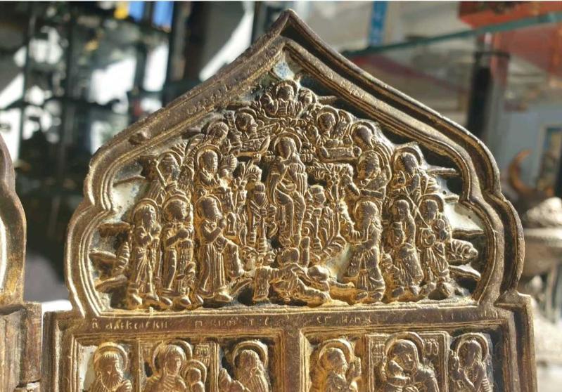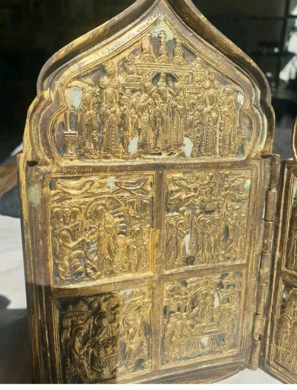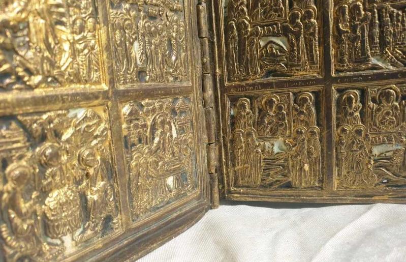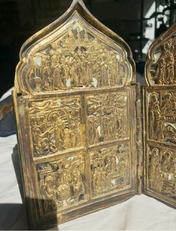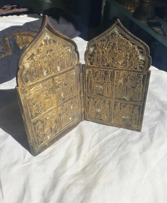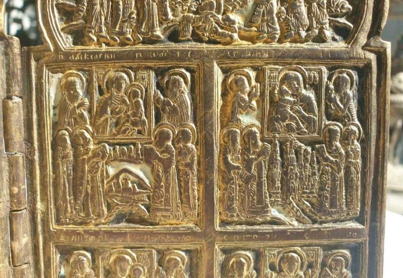 Antik Pirinç Seyahat İkonu. Doğu Ortodoks Kilisesi'nin Önemli Bayramları bronz iki kapaklı ikona 15x20 cm