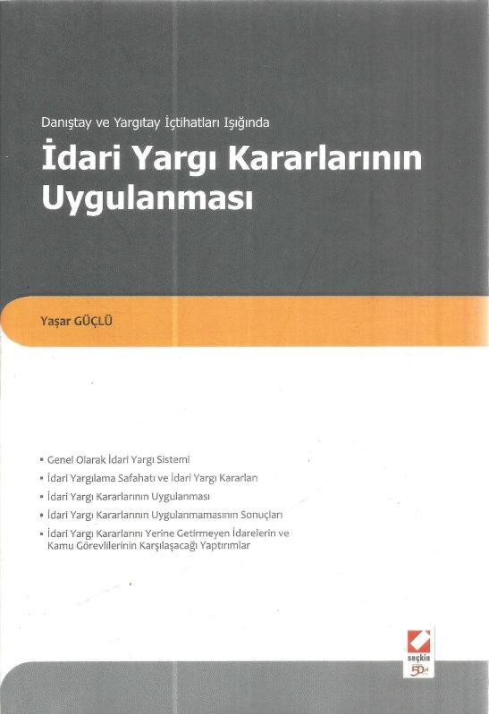 İDARİ YARGI KARARLARININ UYGULANMASI, YAŞAR GÜÇLÜ tarafından kaleme alınmıştır. Kitap 2010 yılında SEÇKİN YAYINCILIK tarafından [ANKARA] yayınlanmıştır. 272 sayfadır. İDARİ YARGI KARARLARININ UYGULANMASI adlı eser Türkçe dilindedir.